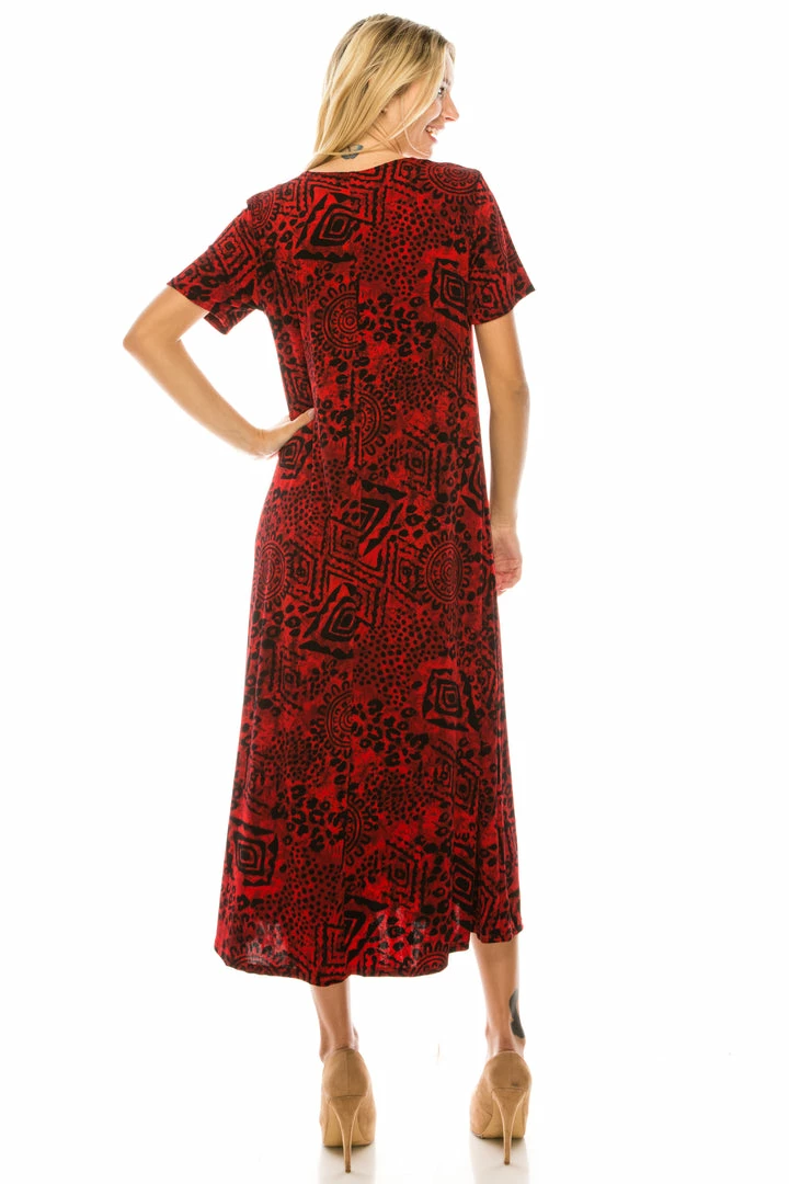 - Short sleeve and soft round-neckline long dress with a variety of prints available and 49 inches in length.
