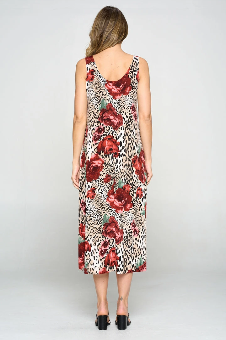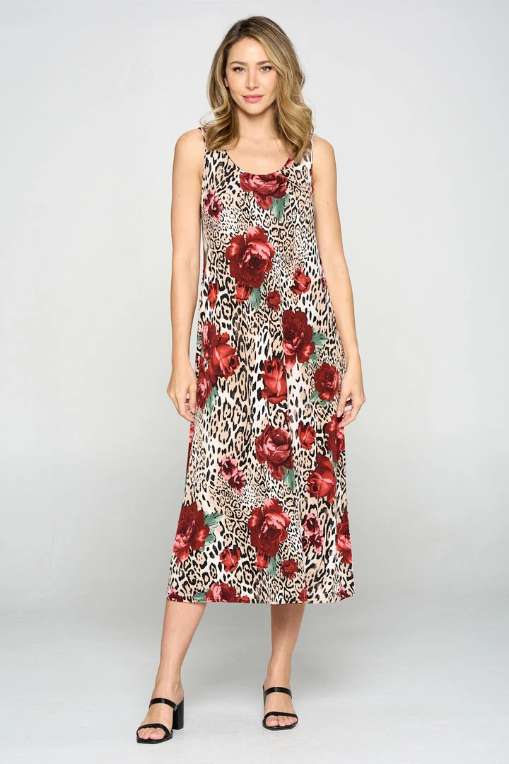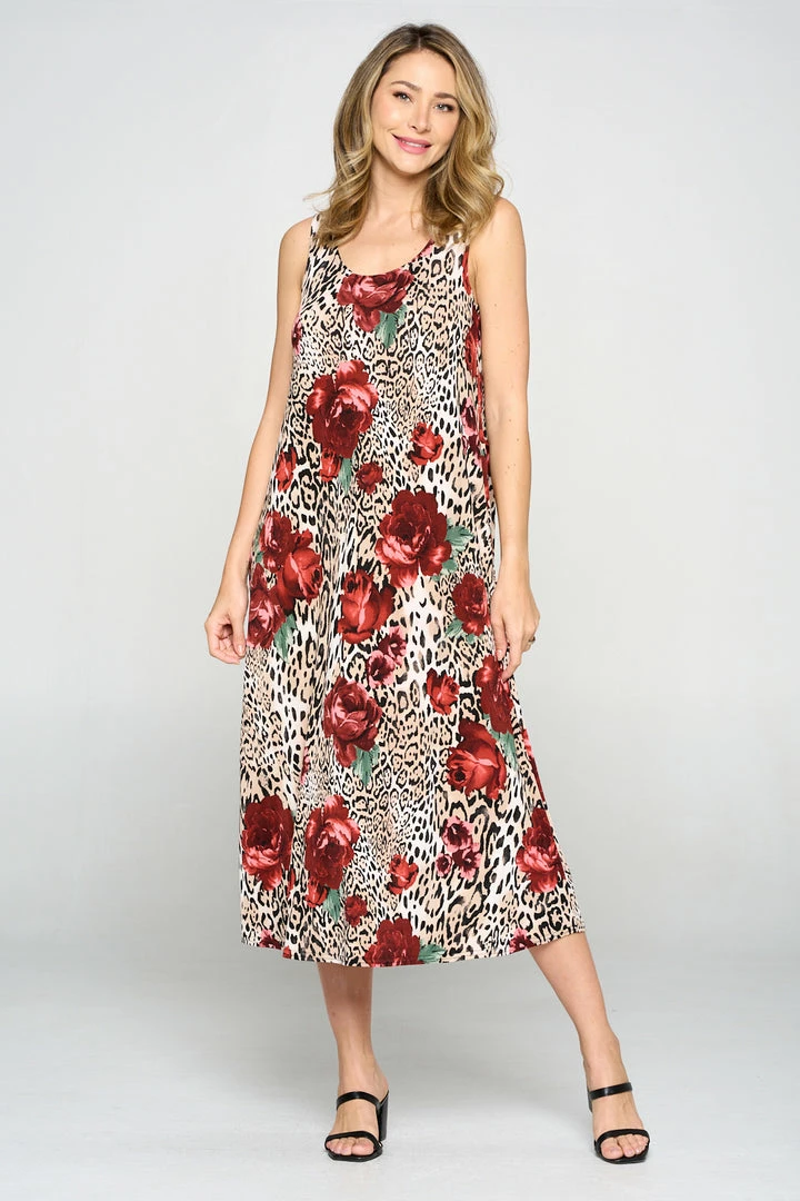 - Sleeveless and soft round-neckline long dress with a variety of prints available and 50 inches in length.