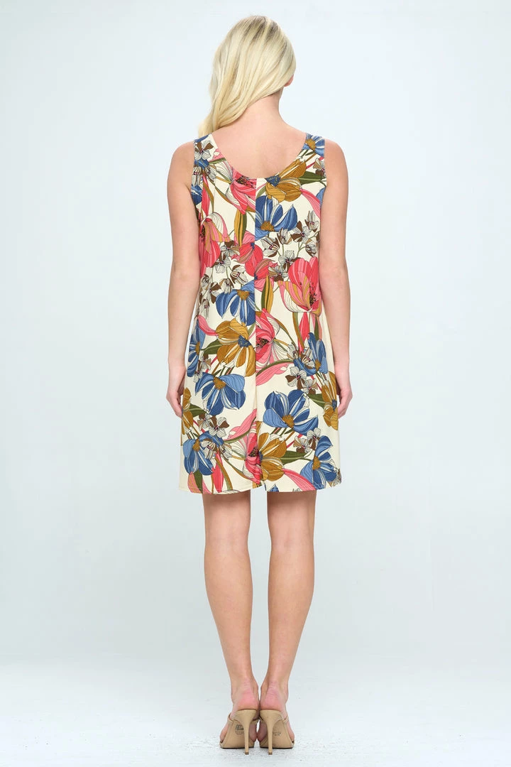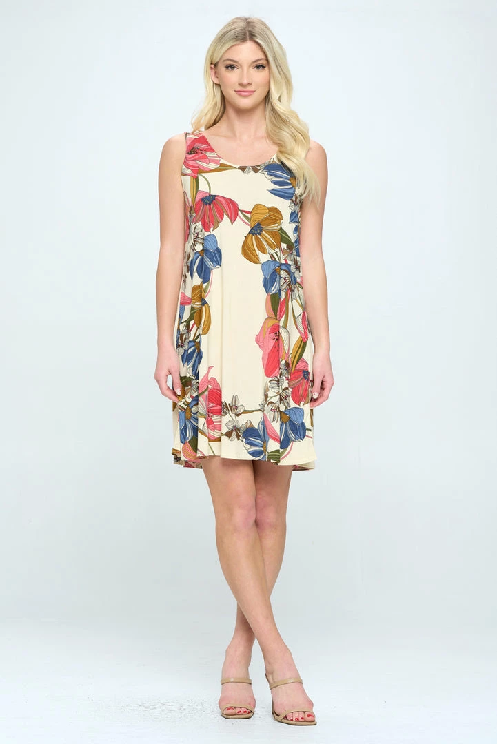 - Sleeveless and soft round-neckline short dress and 38 inches in length with a variety of prints available.