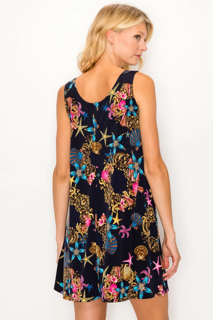 - Sleeveless and soft round-neckline short dress and 38 inches in length with a variety of prints available.