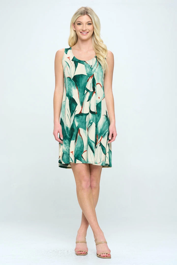 - Sleeveless and soft round-neckline short dress and 38 inches in length with a variety of prints available.