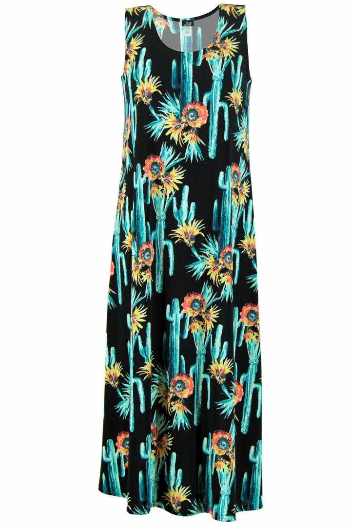 Sleeveless and soft round-neckline long dress with a variety of prints available and 50 inches in length.Hand or machine wash in cold water.Made in USA.90% Polyester, 10% Spandex.