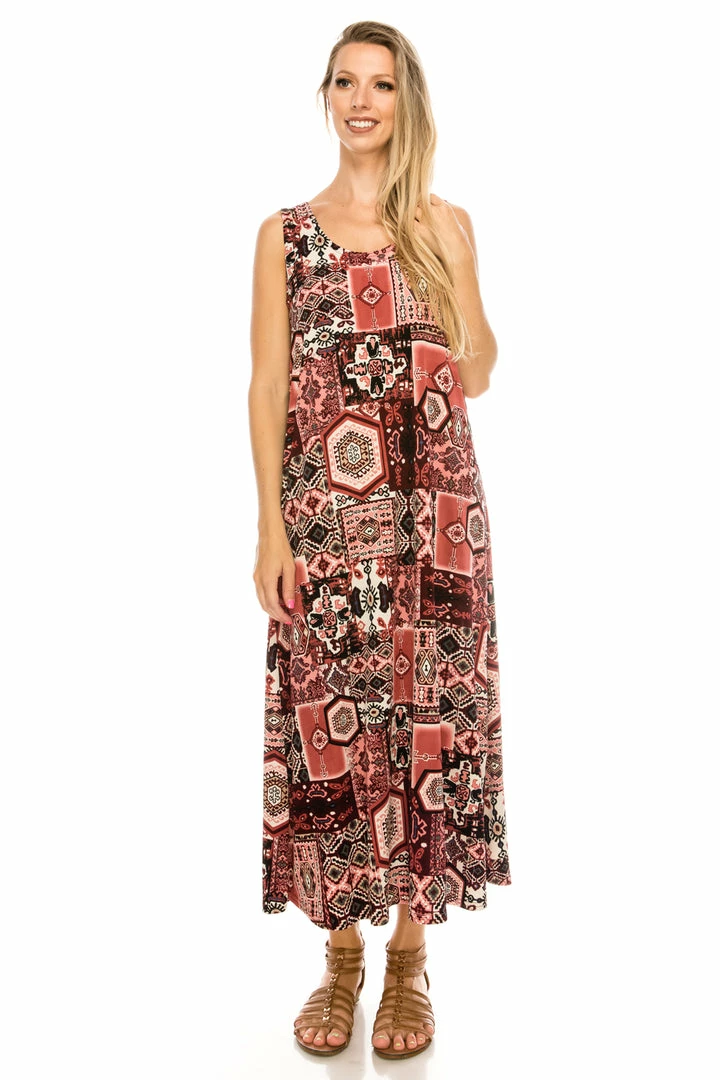 Sleeveless and soft round-neckline long dress with a variety of prints available and 50 inches in length.Hand or machine wash in cold water.Made in USA.90% Polyester, 10% Spandex.