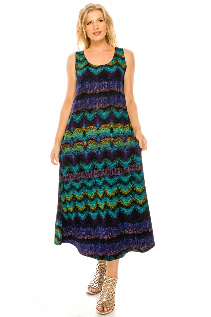 Sleeveless and soft round-neckline long dress with a variety of prints available and 50 inches in length.Hand or machine wash in cold water.Made in USA.90% Polyester, 10% Spandex.