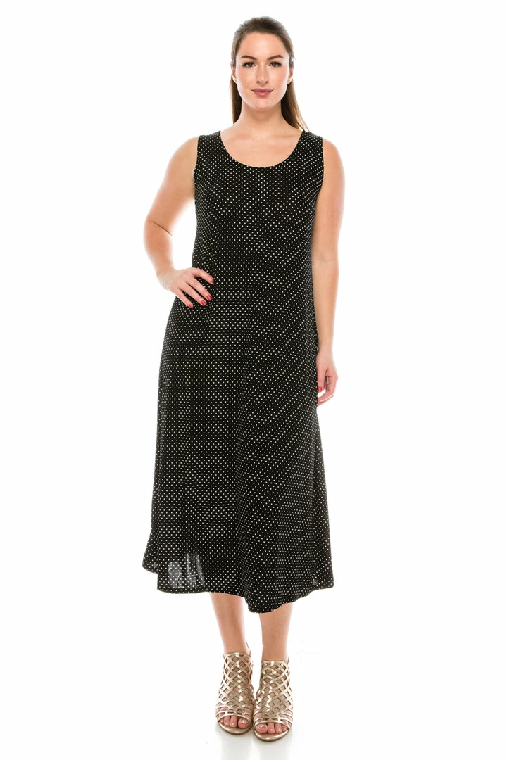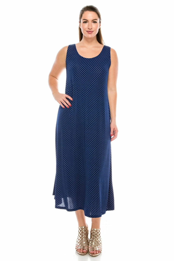 Sleeveless and soft round-neckline long dress with a variety of prints available and 50 inches in length.Hand or machine wash in cold water.Made in USA.90% Polyester, 10% Spandex.
