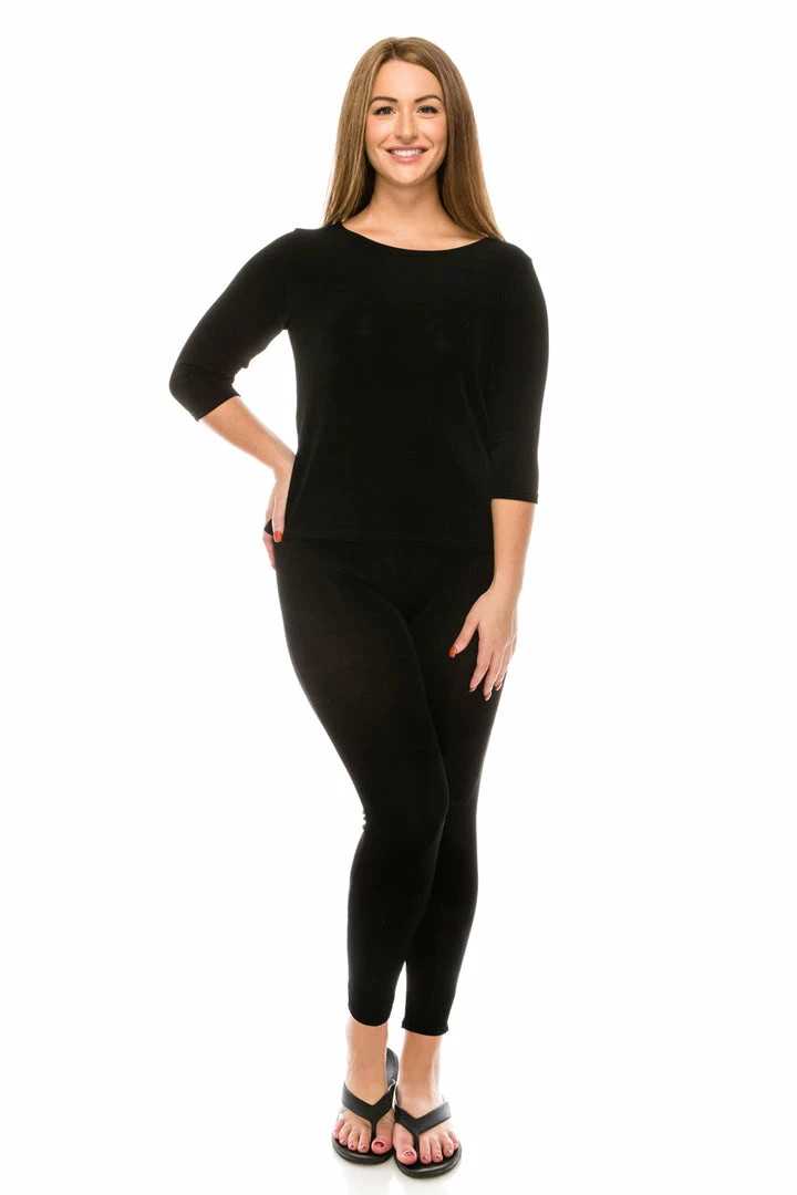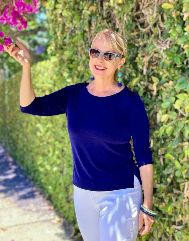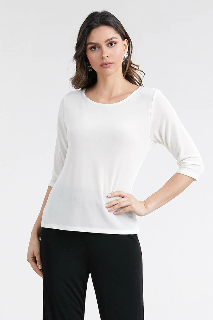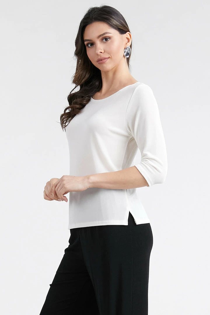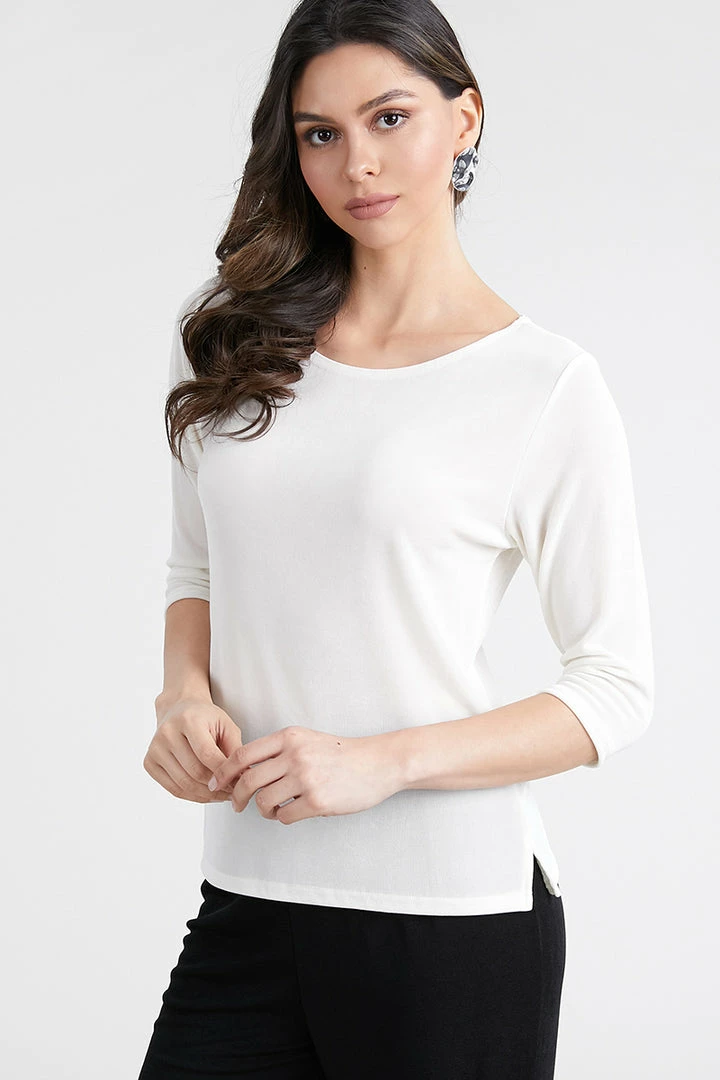 - Quarter sleeve, scoop neckline with side vents at bottom hem.