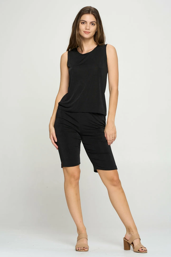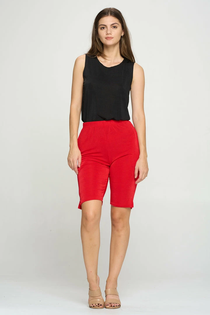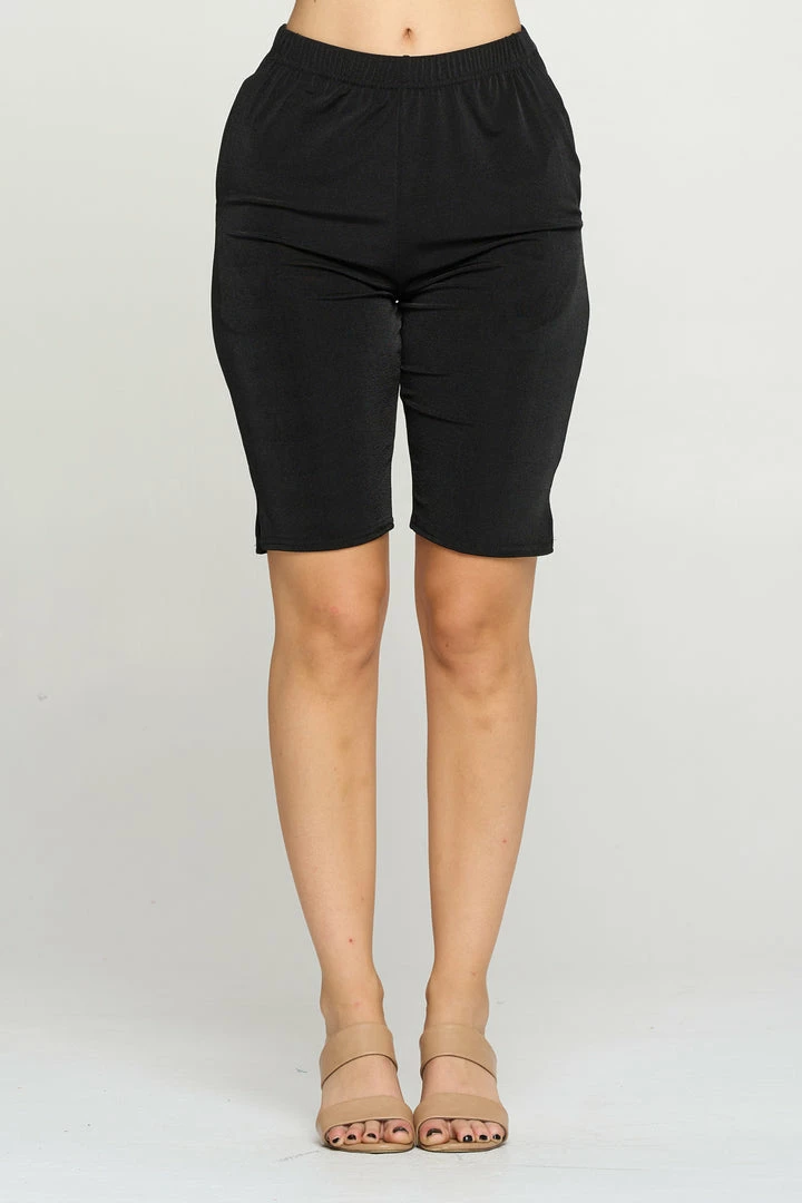 - Slip into these Bermuda shorts for warm weather comfort. Pull-on styling with elastic waist. Roomy front pockets.