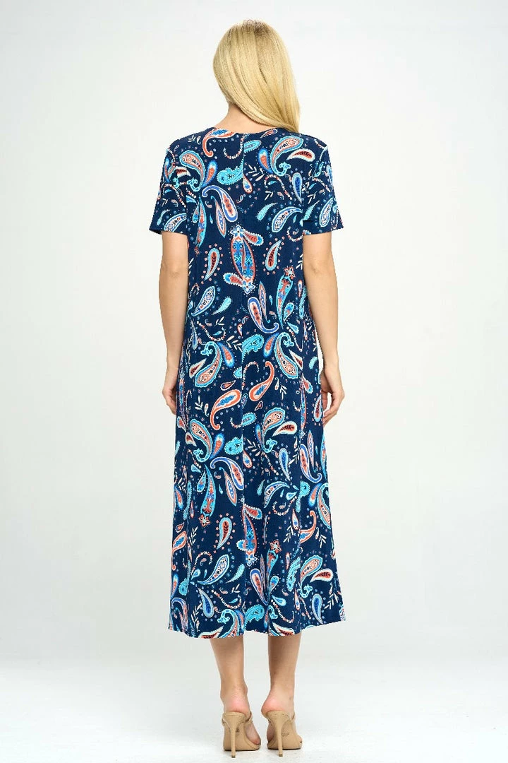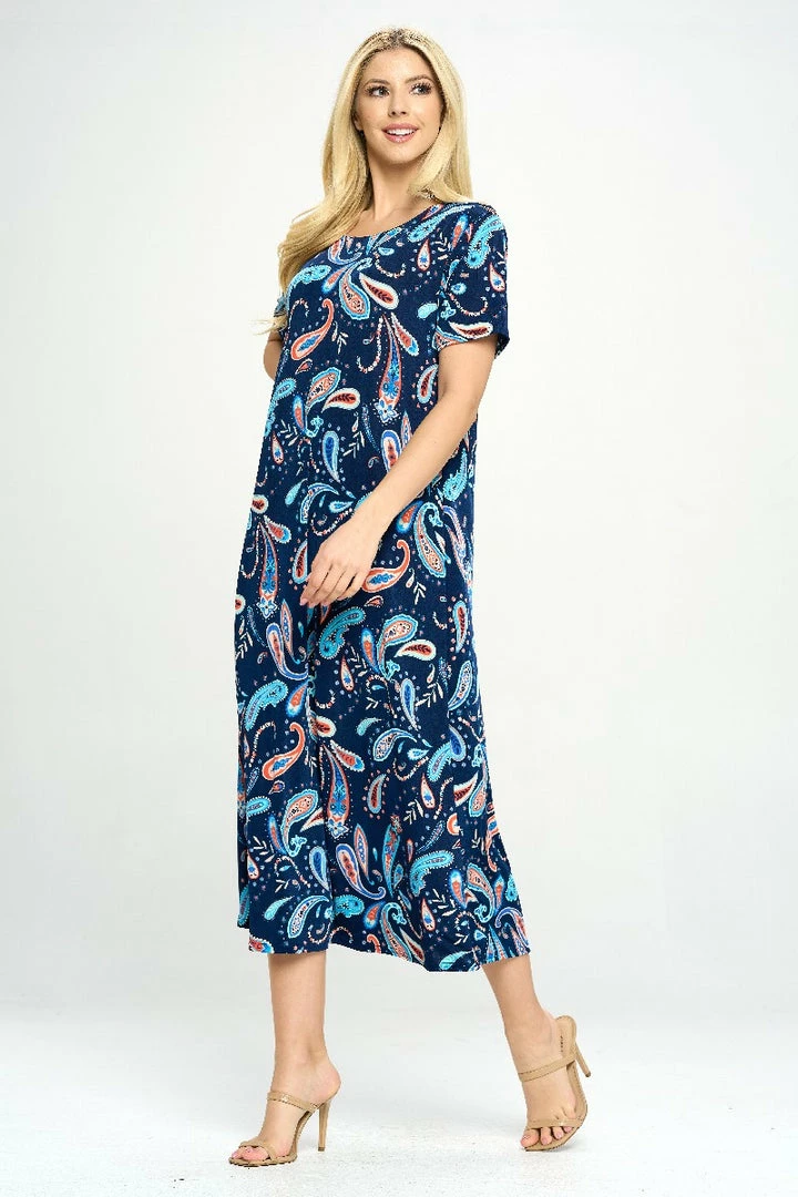 - Short sleeve and soft round-neckline long dress with a variety of prints available and 49 inches in length.