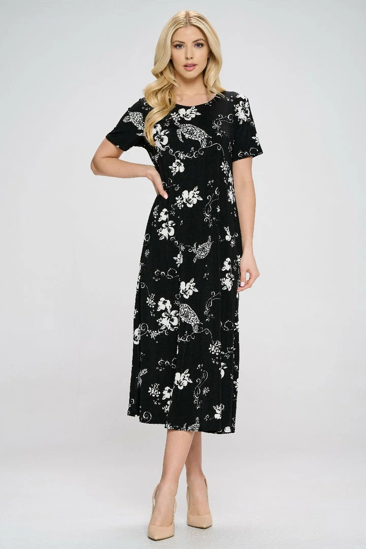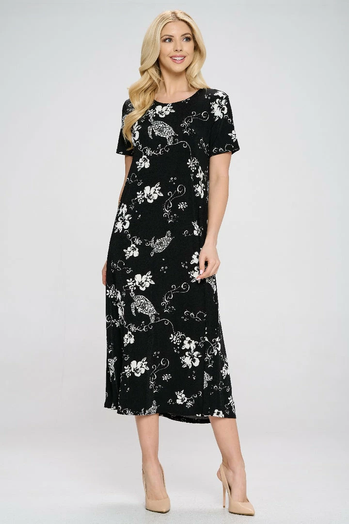 - Short sleeve and soft round-neckline long dress with a variety of prints available.