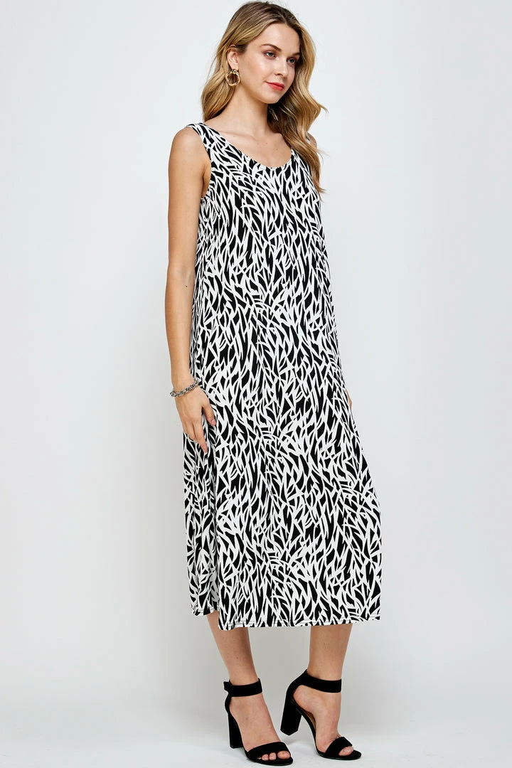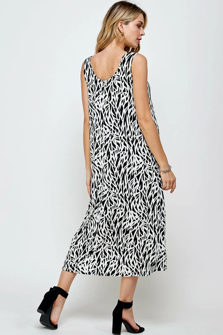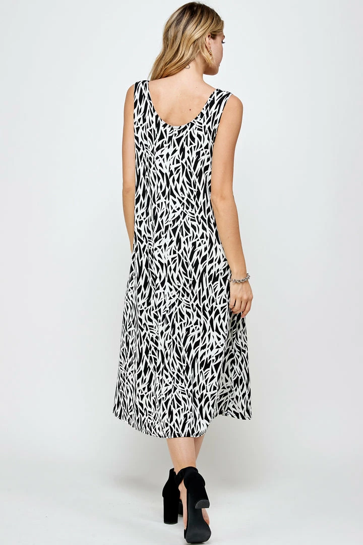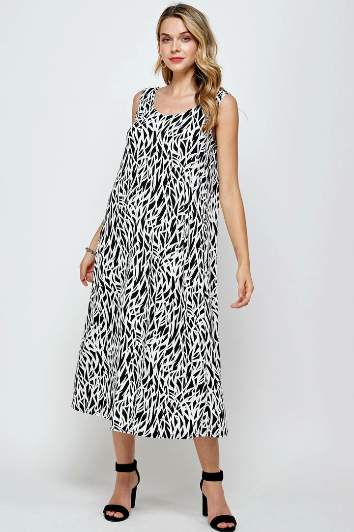 - Sleeveless and soft round-neckline long dress with a variety of prints available and 50 inches in length.
