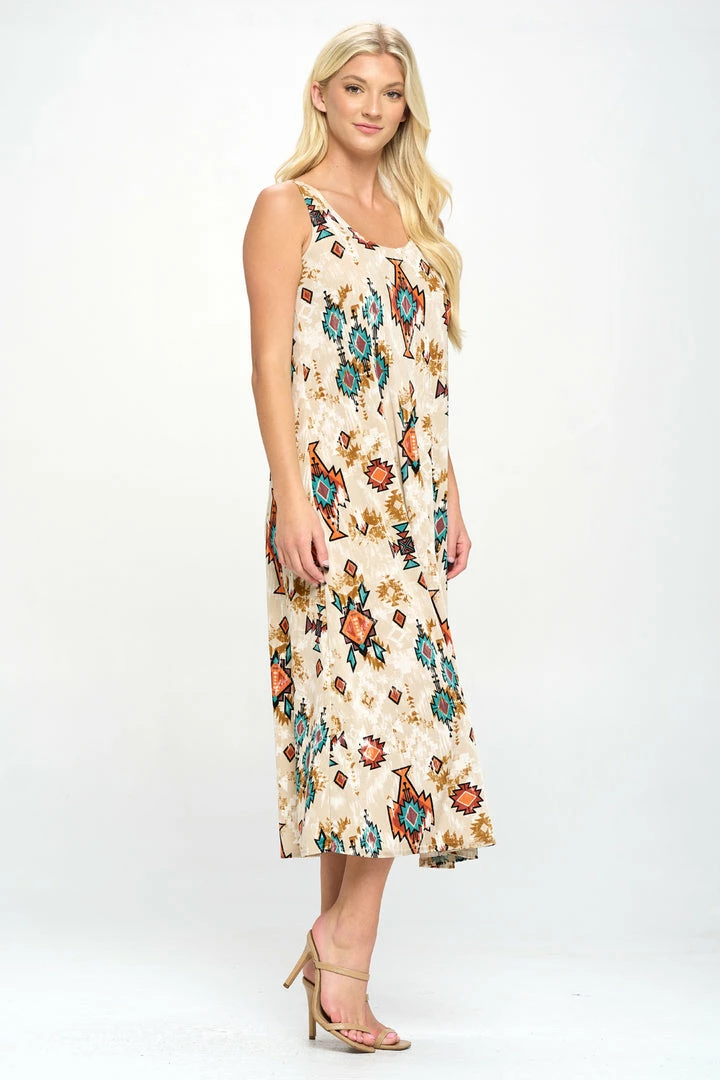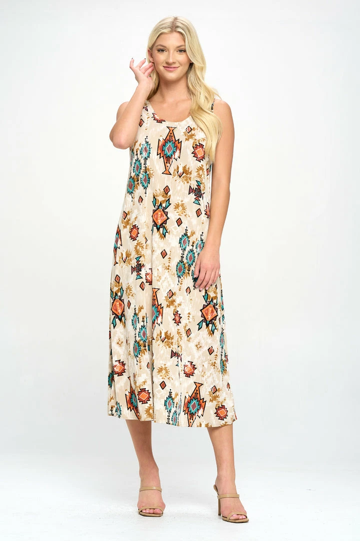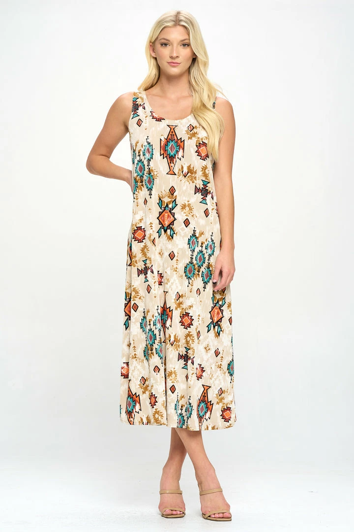 - Sleeveless and soft round-neckline long dress with a variety of prints available and 50 inches in length.