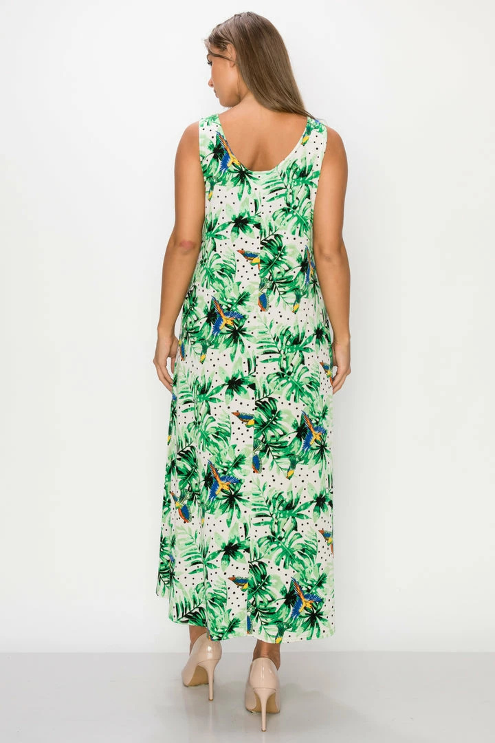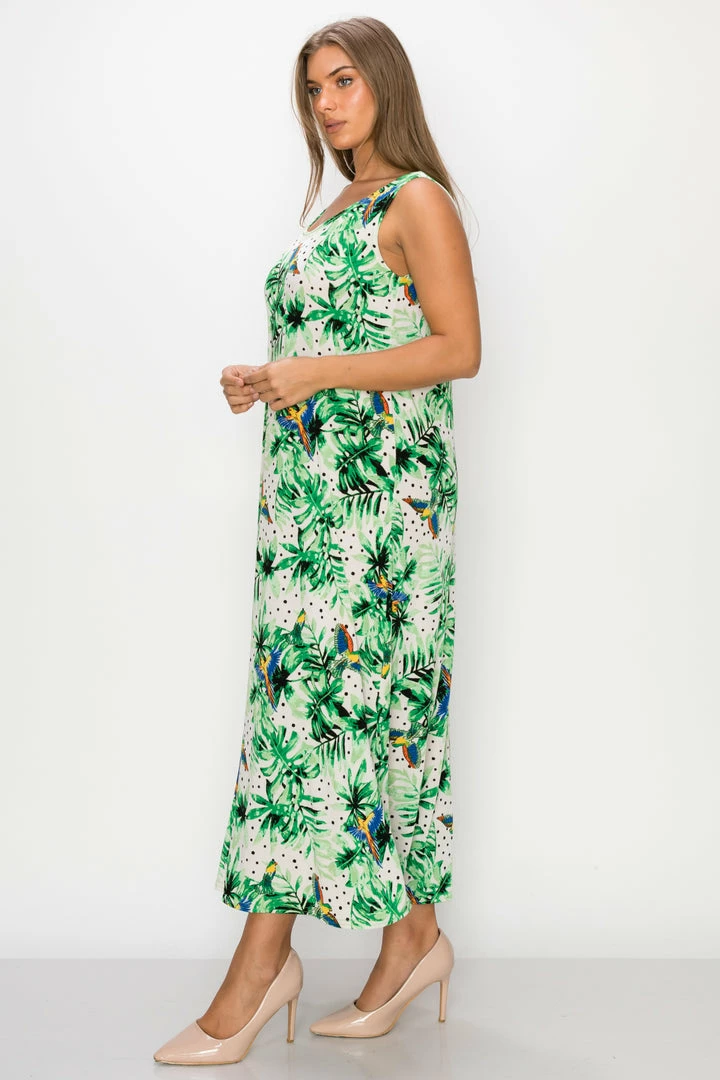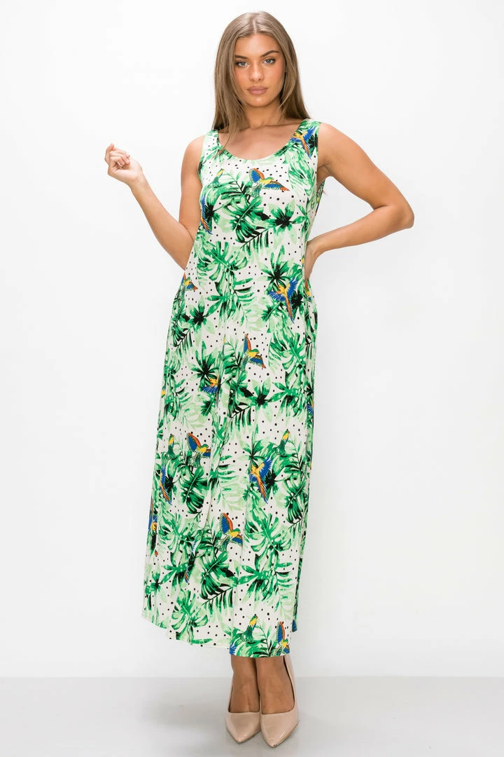- Sleeveless and soft round-neckline long dress with a variety of prints available and 50 inches in length.
