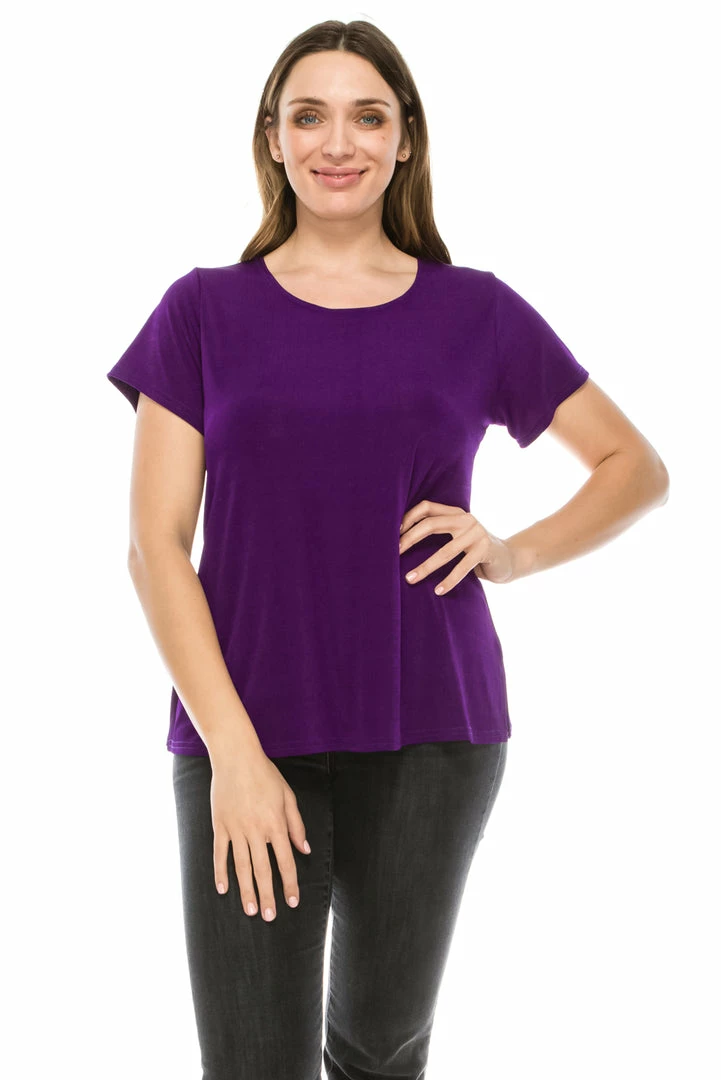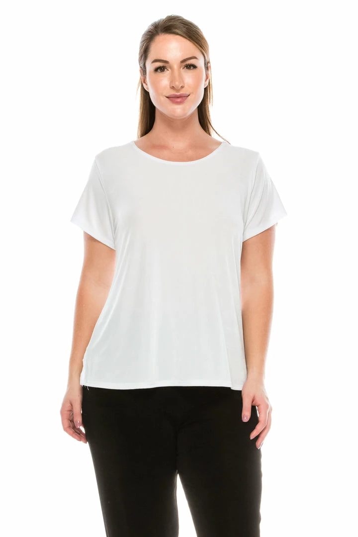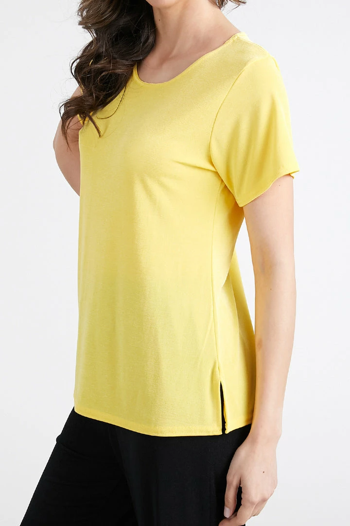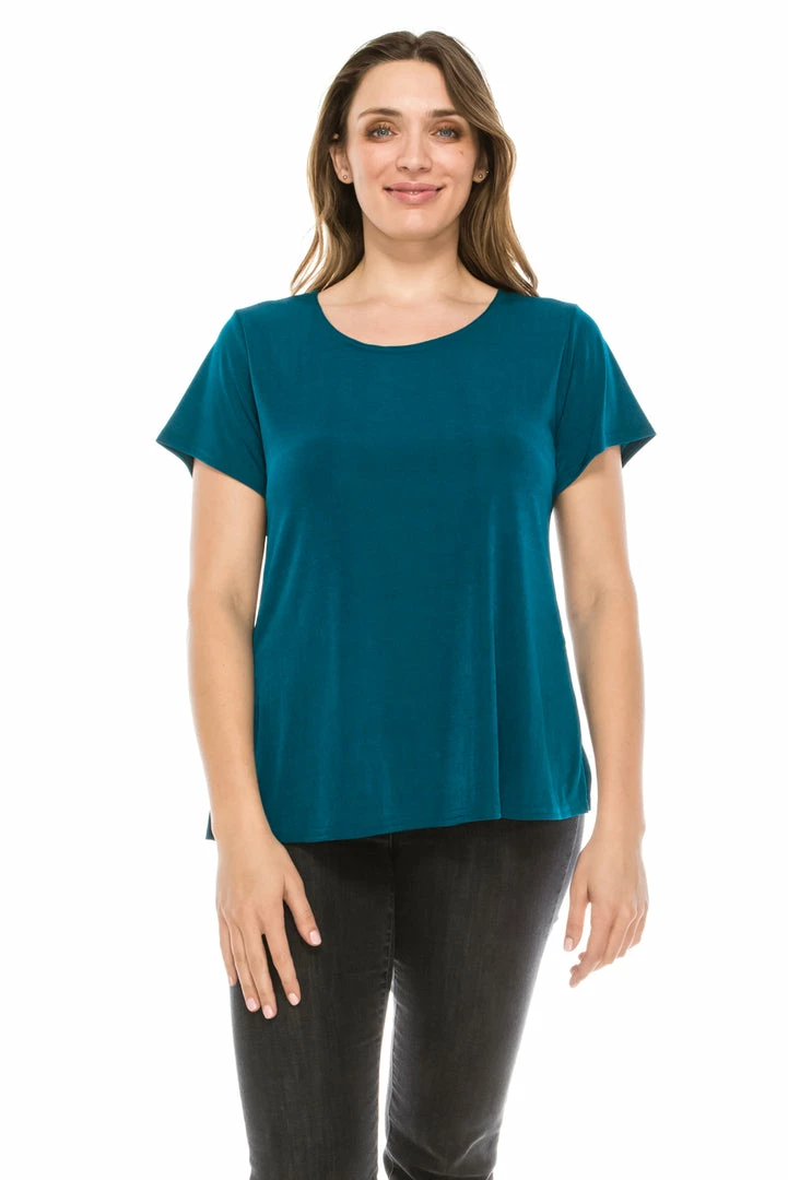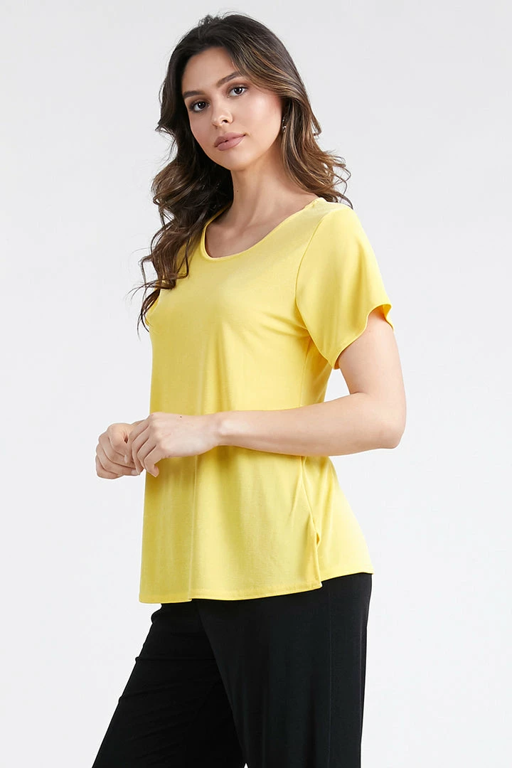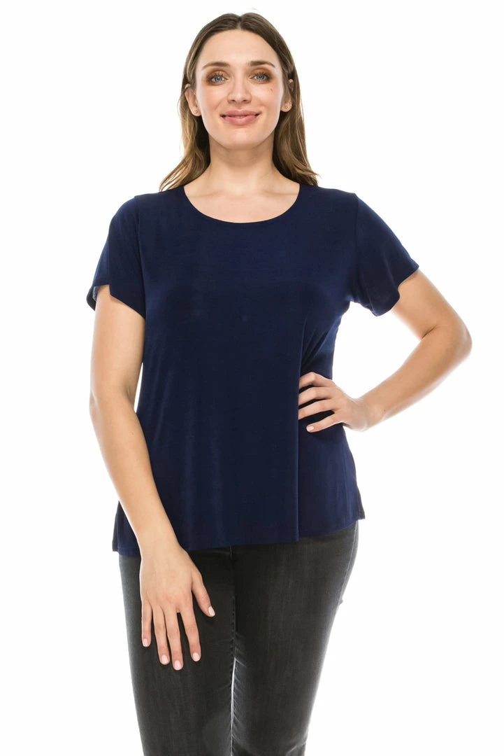 - Short sleeves and soft round-neckline with side vents at bottom hem.