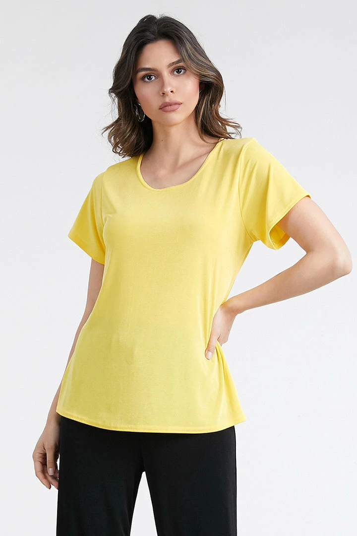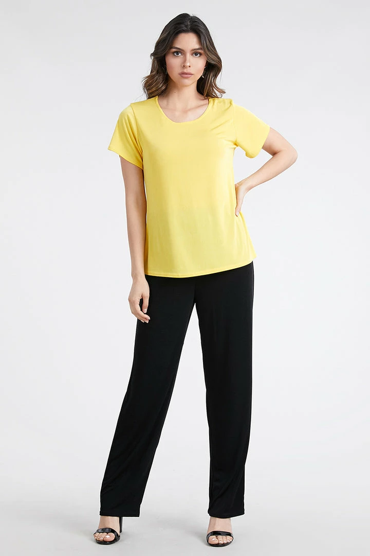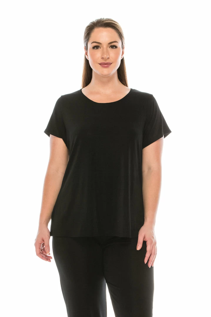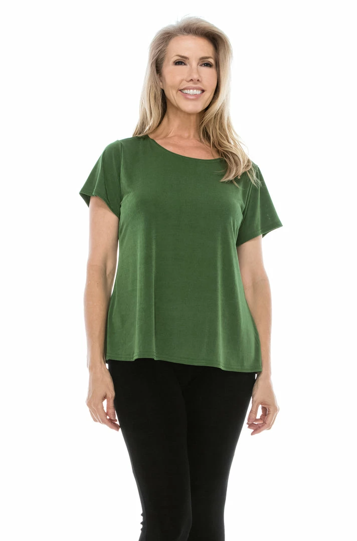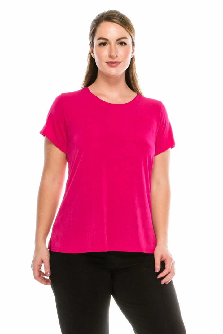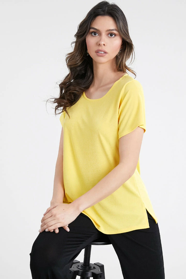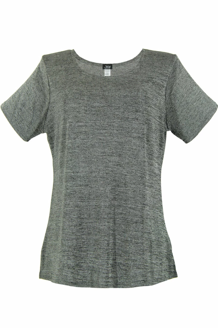 - Short sleeves and soft round-neckline with side vents at bottom hem.