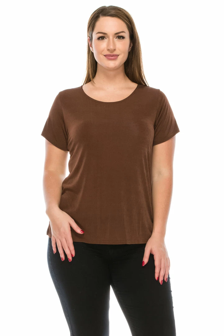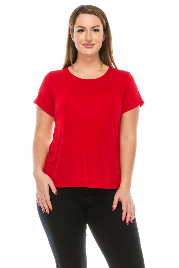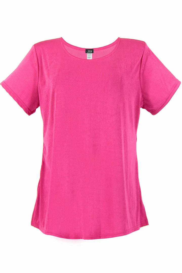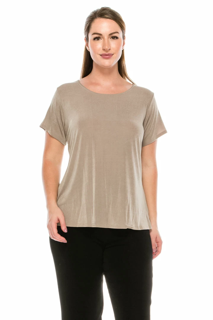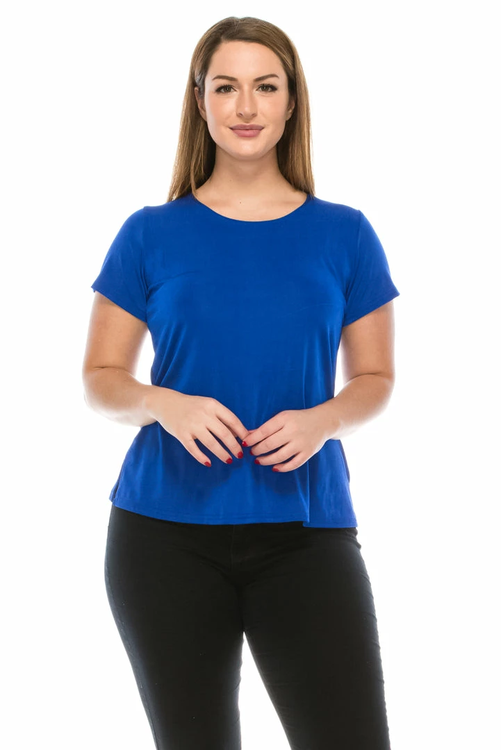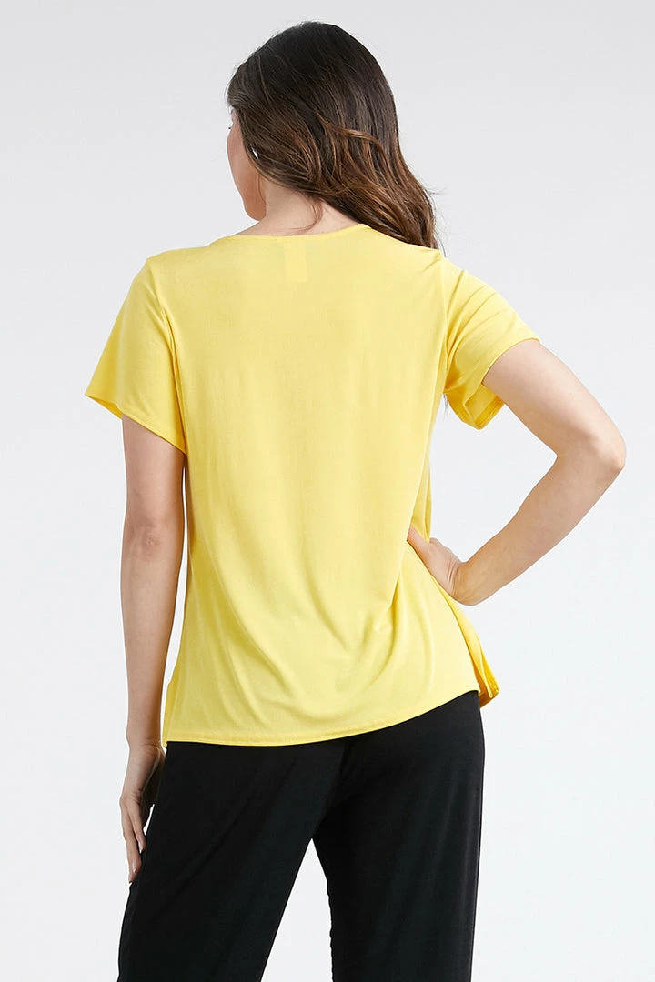 - Short sleeves and soft round-neckline with side vents at bottom hem.