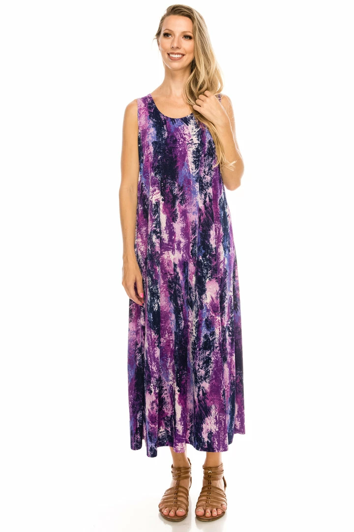 Sleeveless and soft round-neckline long dress with a variety of prints available and 50 inches in length.Hand or machine wash in cold water.Made in USA.90% Polyester, 10% Spandex.