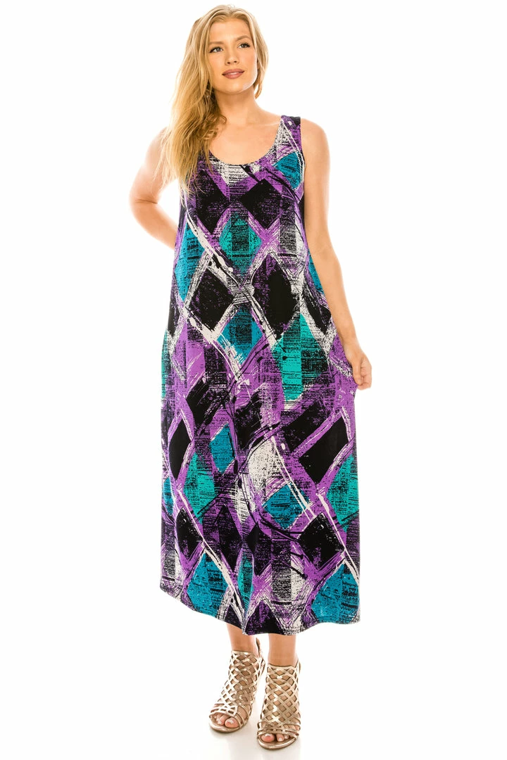 Sleeveless and soft round-neckline long dress with a variety of prints available and 50 inches in length.Hand or machine wash in cold water.Made in USA.90% Polyester, 10% Spandex.