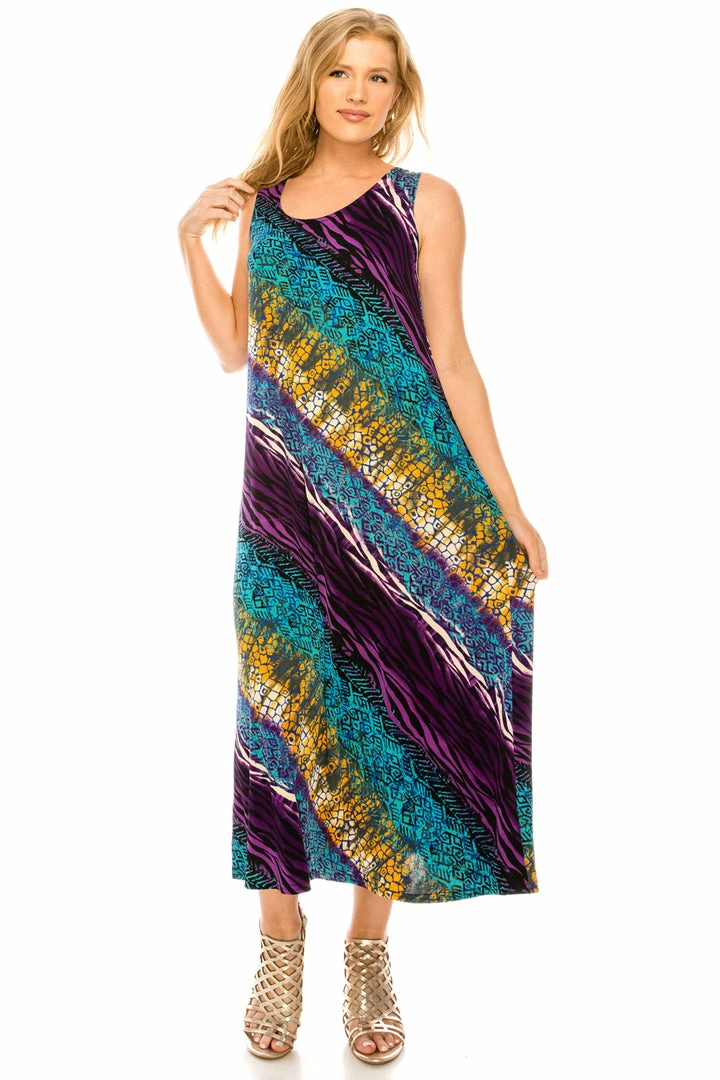 Sleeveless and soft round-neckline long dress with a variety of prints available and 50 inches in length.Hand or machine wash in cold water.Made in USA.90% Polyester, 10% Spandex.