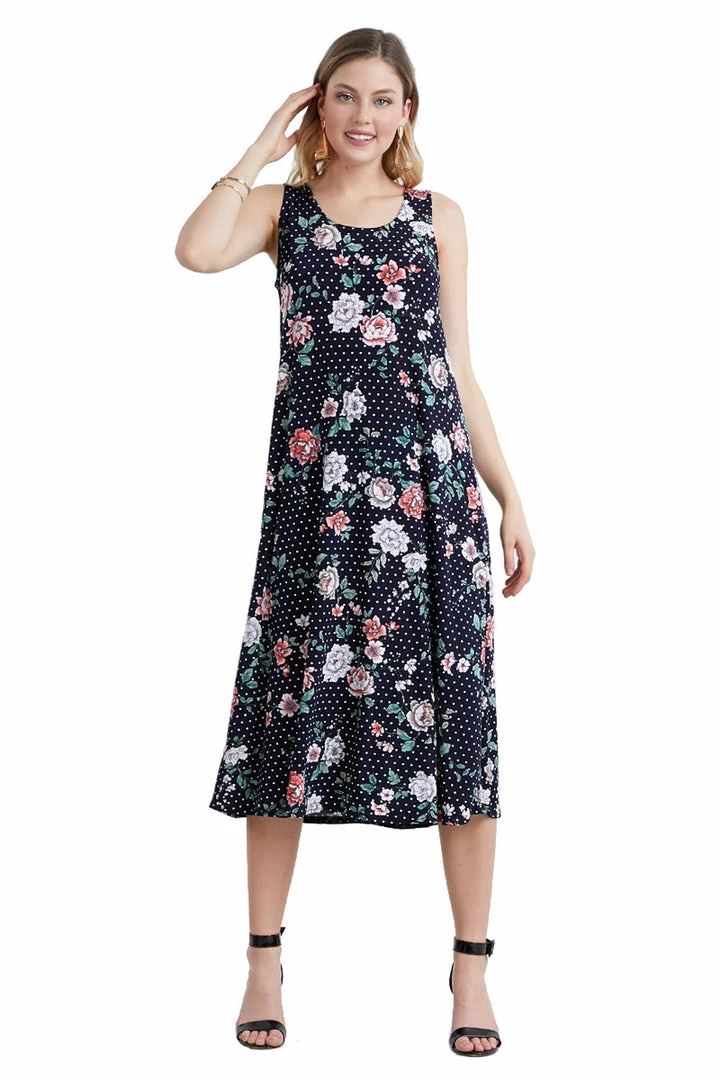 Sleeveless and soft round-neckline long dress with a variety of prints available and 50 inches in length.Hand or machine wash in cold water.Made in USA.90% Polyester, 10% Spandex.