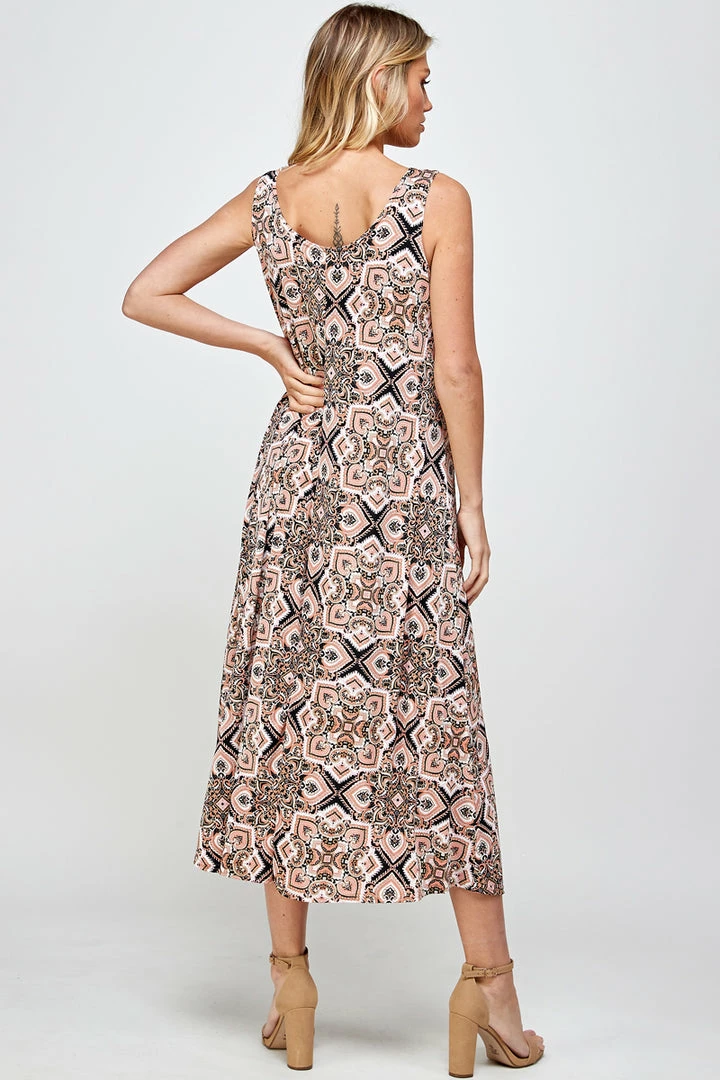 - Sleeveless and soft round-neckline long dress with a variety of prints available and 50 inches in length.