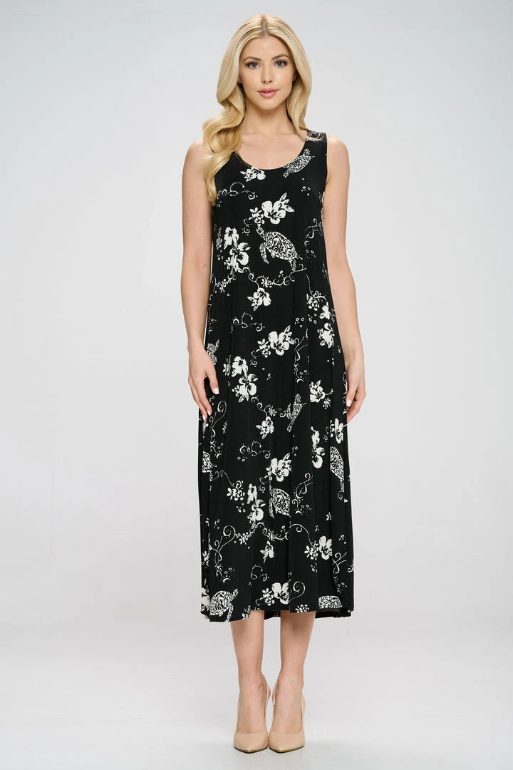 - Sleeveless and soft round-neckline long dress with a variety of prints available and 50 inches in length.