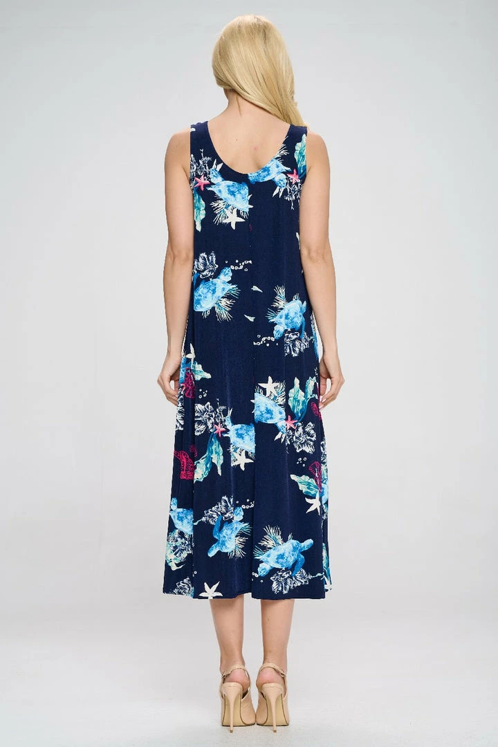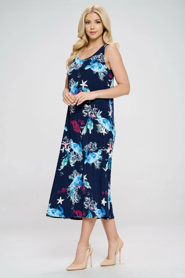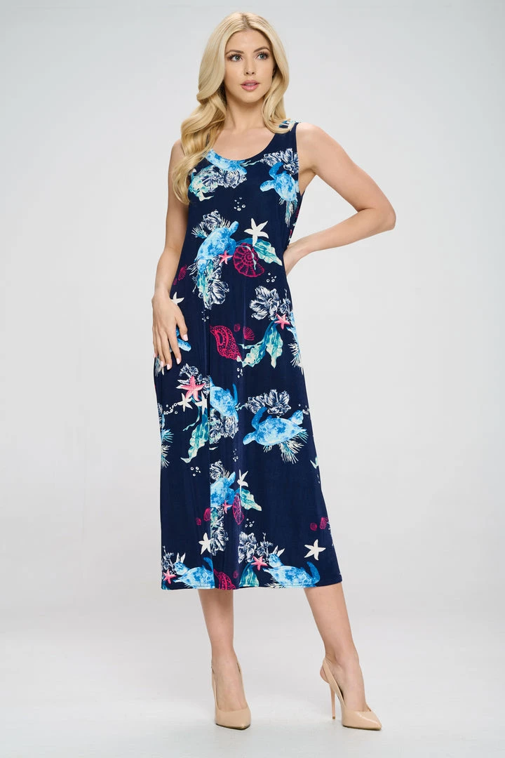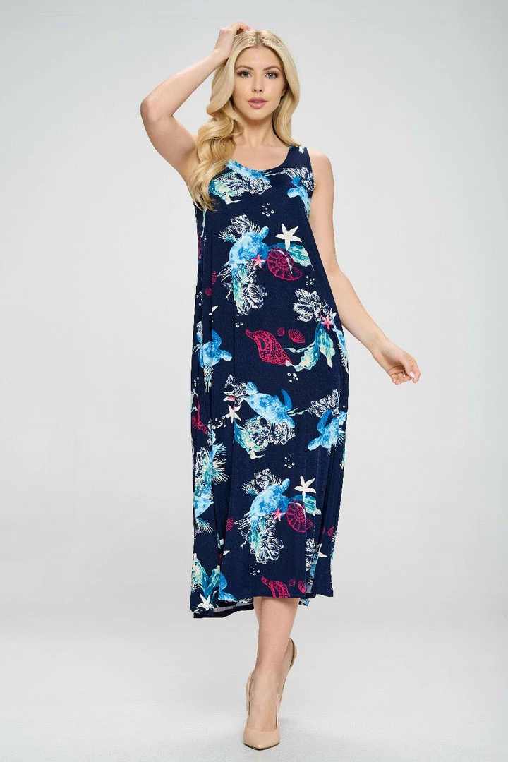 - Sleeveless and soft round-neckline long dress with a variety of prints available and 50 inches in length.