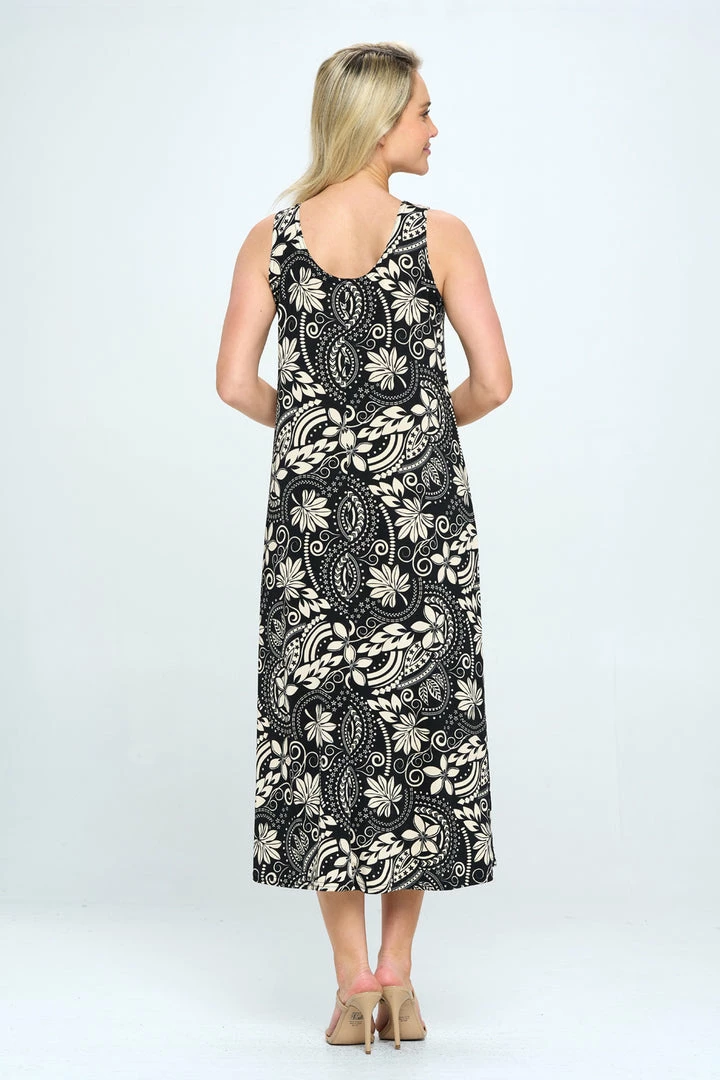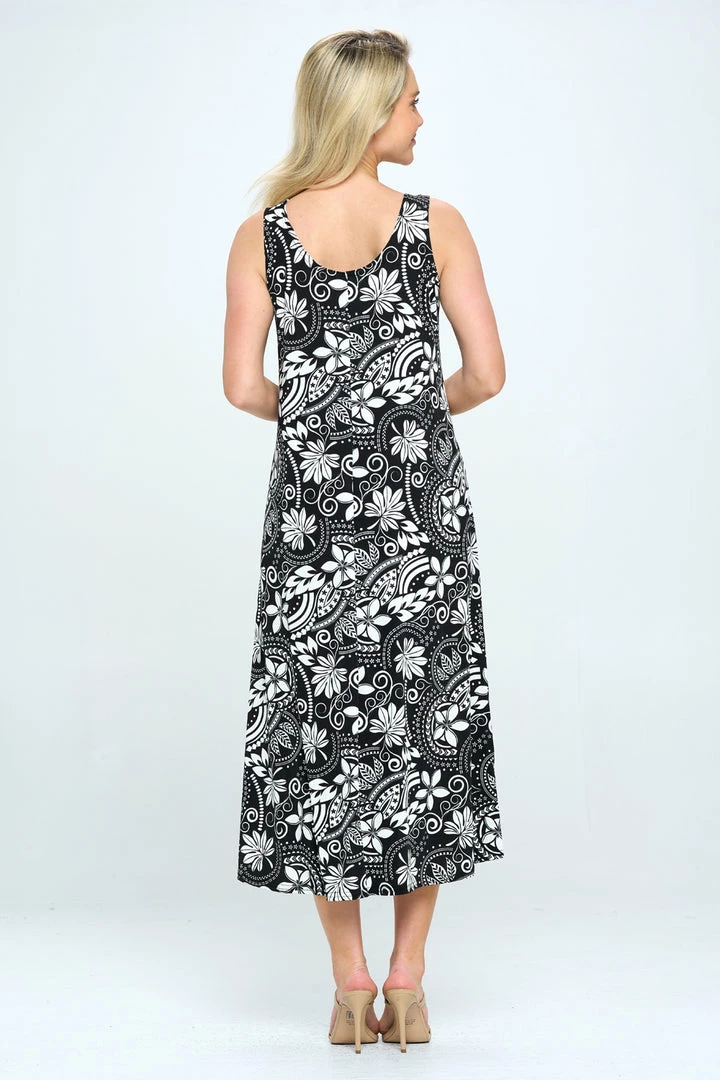 - Sleeveless and soft round-neckline long dress with a variety of prints available and 50 inches in length.
