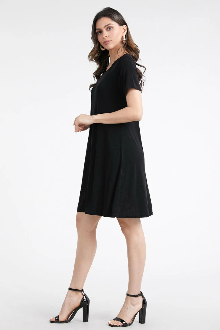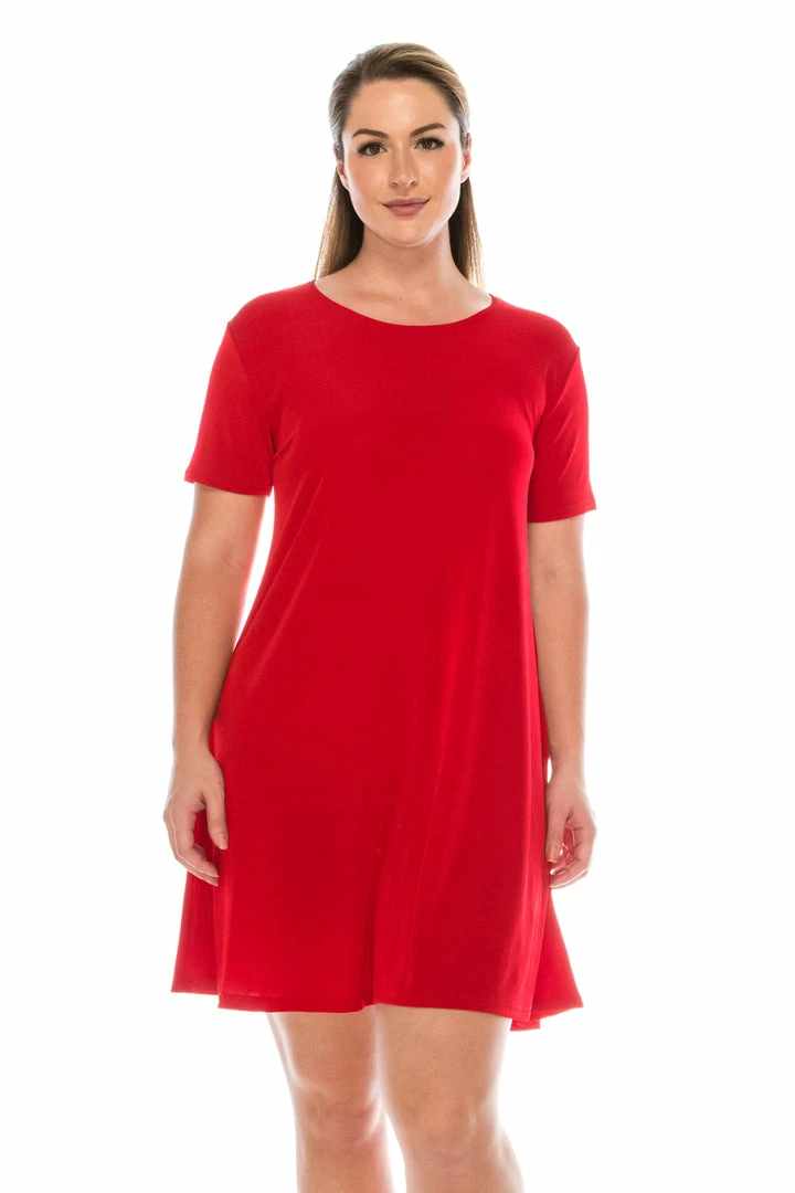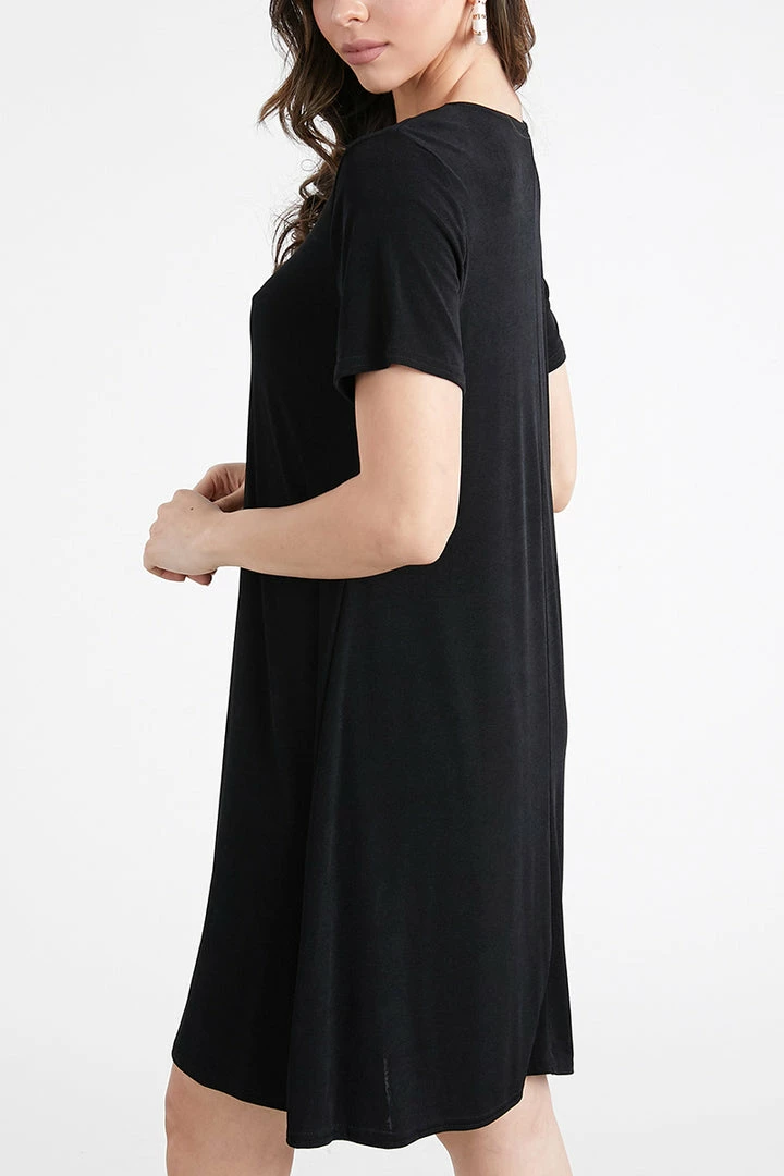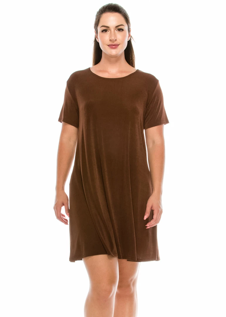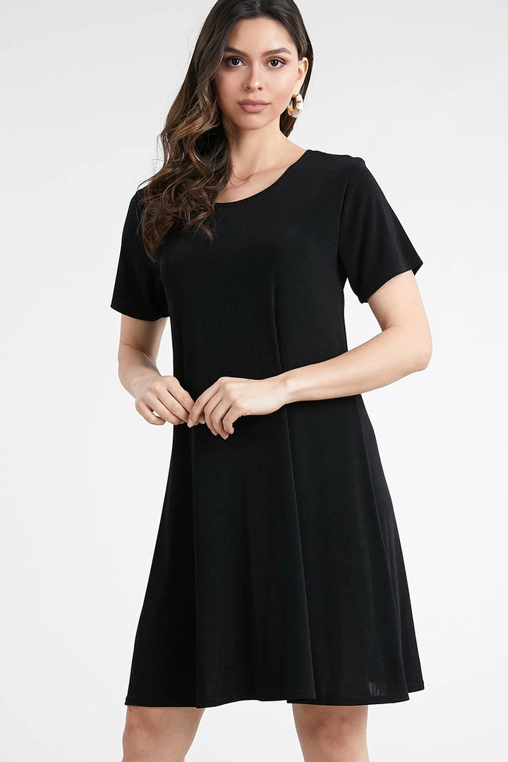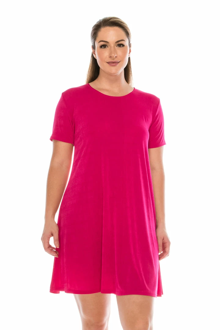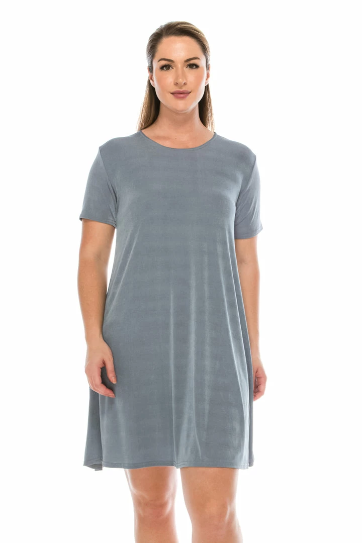 - Short sleeve and soft round-neckline short dress and 37 inches in length.