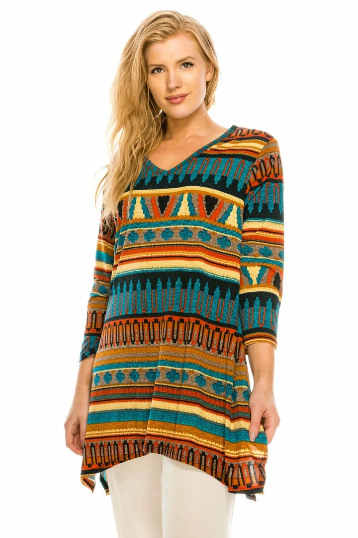 HIT V-neck binding top with a variety of prints available.Hand or machine wash in cold water.Made in USA.94% Polyester, 6% Spandex.