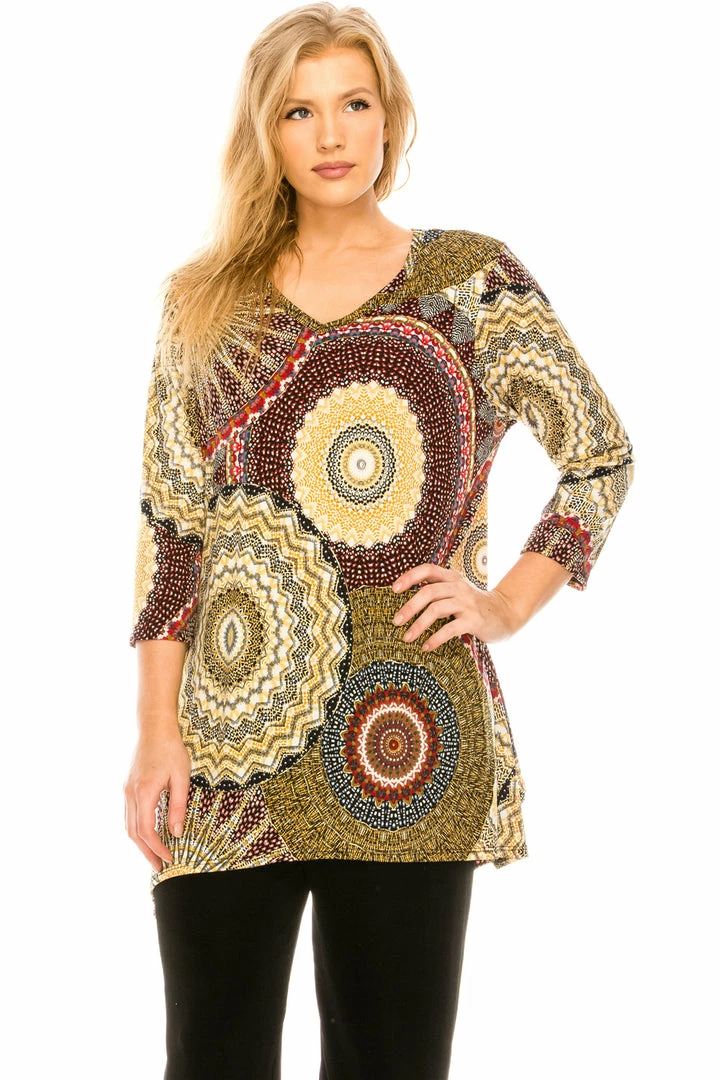 Three quarter sleeve V-neck Binding top .Hand or machine wash in cold water.Made in USA.92% Polyester, 8% Spandex.