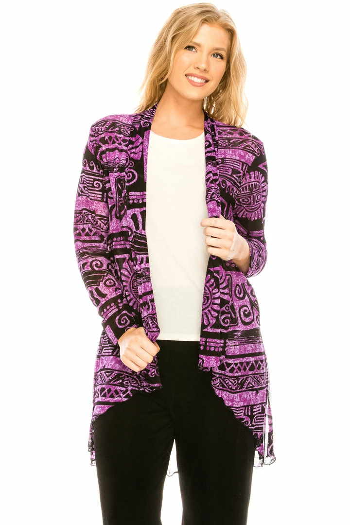 Long sleeve, onion skin jacket with asymetric bottom with a variety of prints available.Hand or machine wash in cold water.Made in USA.90% Polyester, 10% Spandex.