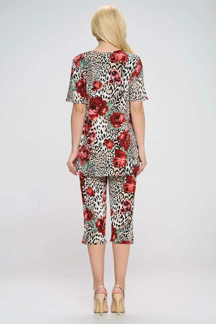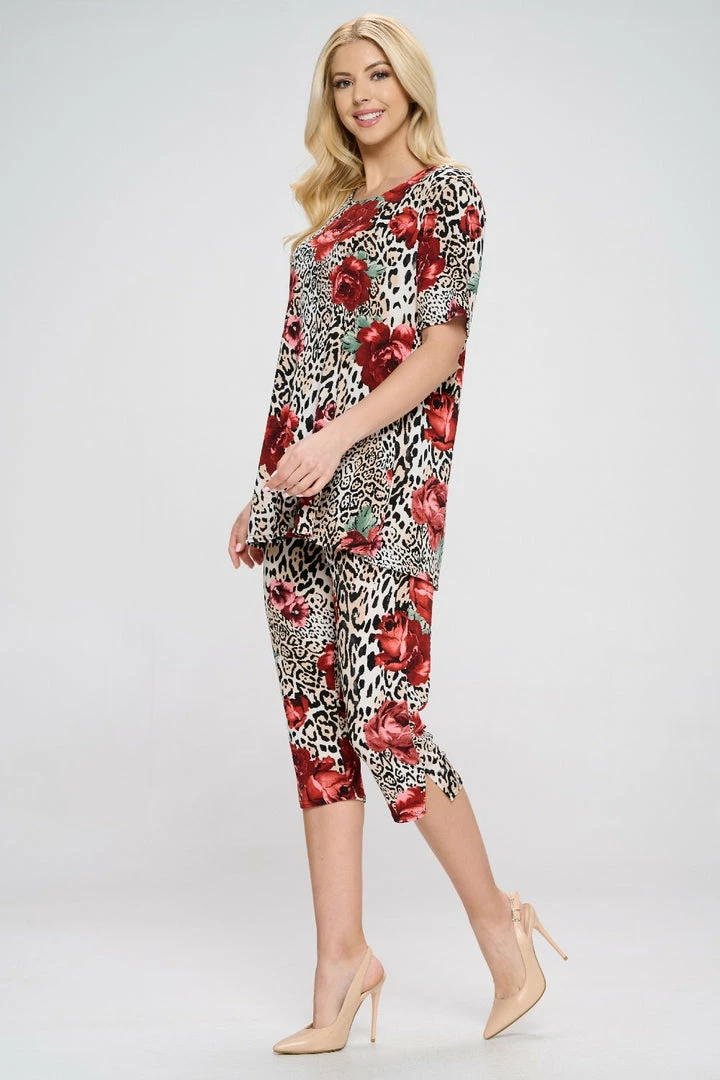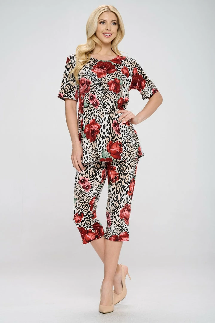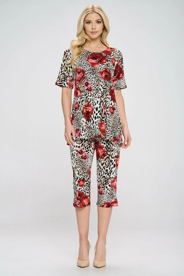 - Round neck short sleeve top and capri pants set with a variety of prints available.