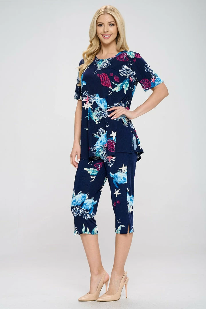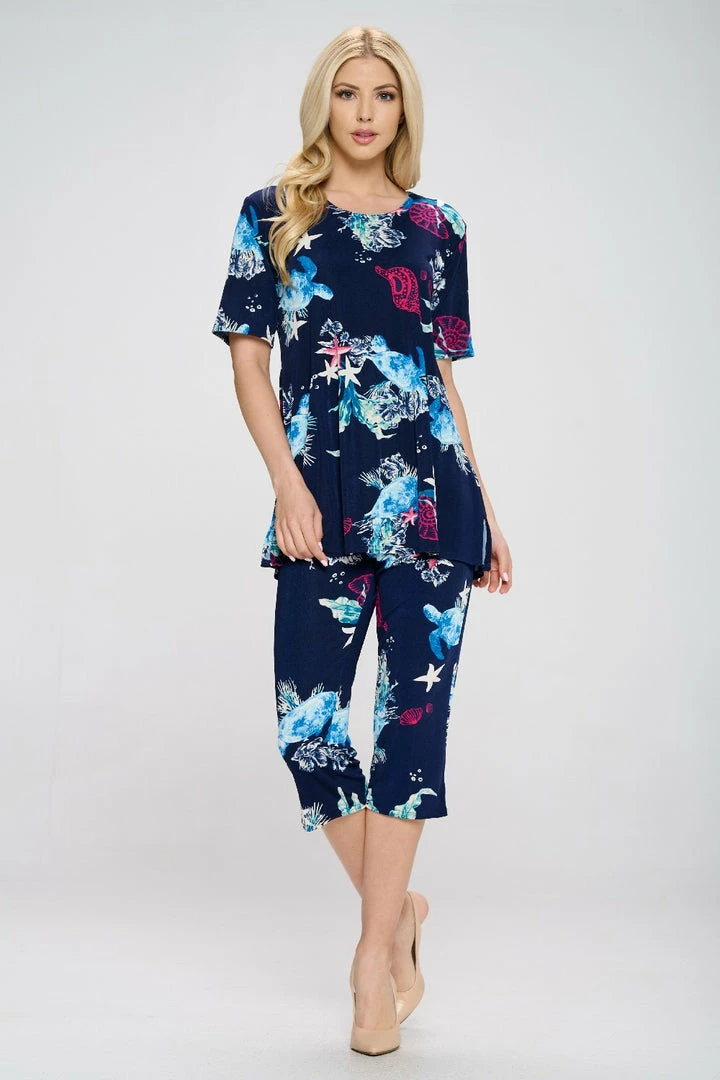 - Round neck short sleeve top and capri pants set with a variety of prints available.