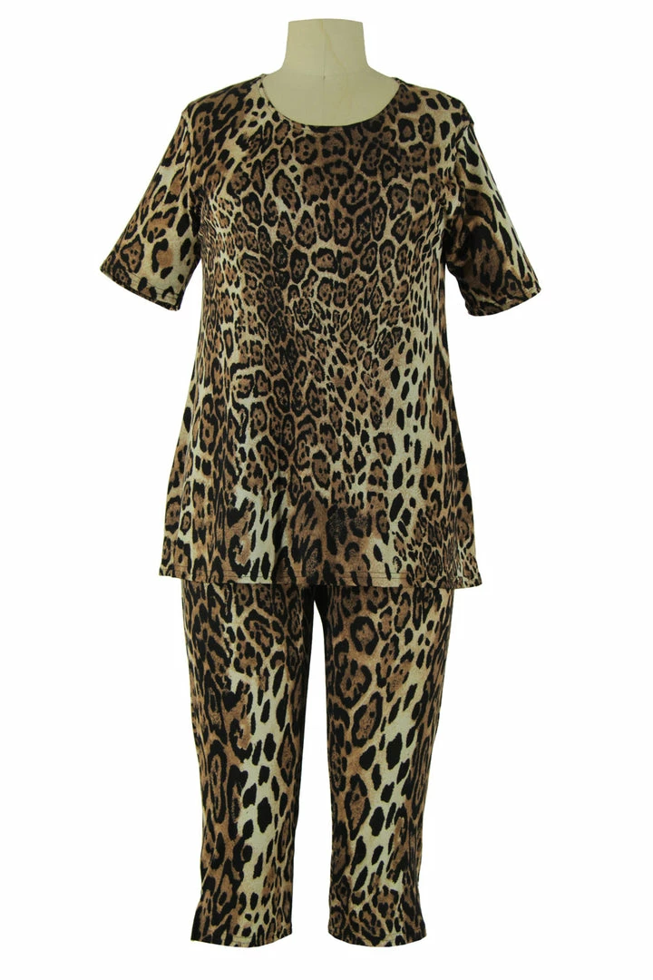 Round neck short sleeve top and capri pants set with a variety of prints available.Hand or machine wash in cold water.Made in USA.90% Polyester, 10% Spandex.