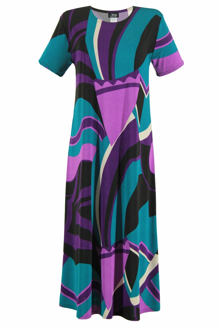 Short sleeve and soft round-neckline long dress with a variety of prints available.Hand or machine wash in cold water.Made in USA.90% Polyester, 10% Spandex.