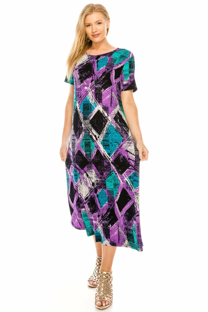 Short sleeve and soft round-neckline long dress with a variety of prints available.Hand or machine wash in cold water.Made in USA.90% Polyester, 10% Spandex.