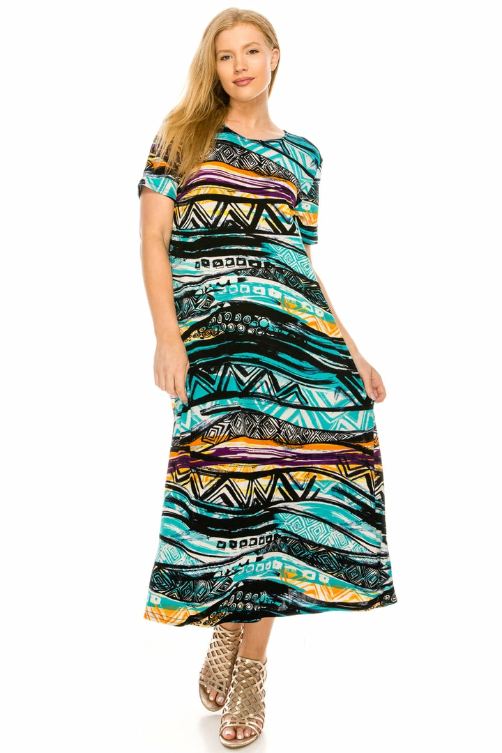 - Short sleeve and soft round-neckline long dress with a variety of prints available.
