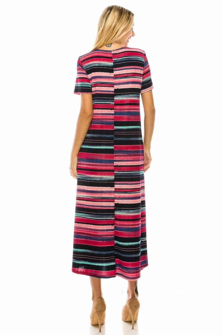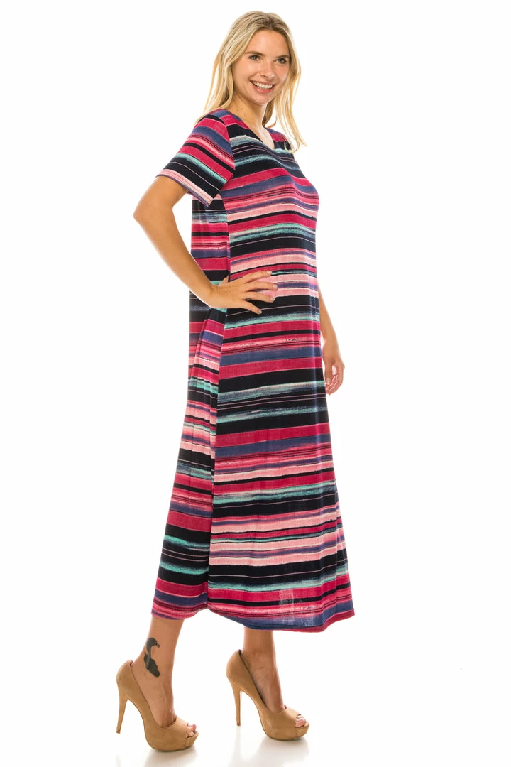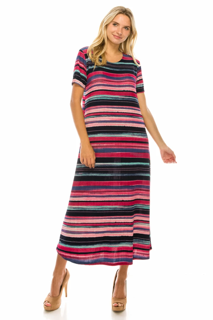- Short sleeve and soft round-neckline long dress with a variety of prints available.