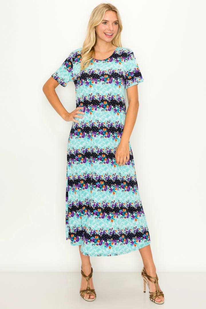 - Short sleeve and soft round-neckline long dress with a variety of prints available.
