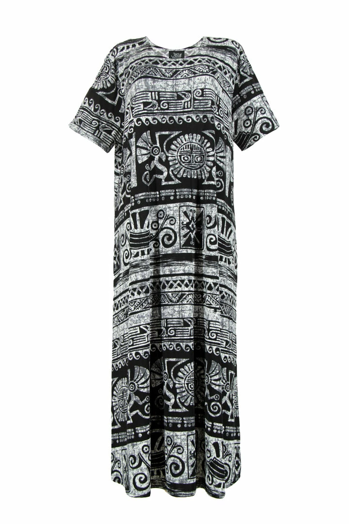 Short sleeve and soft round-neckline long dress with a variety of prints available.Hand or machine wash in cold water.Made in USA.90% Polyester, 10% Spandex.