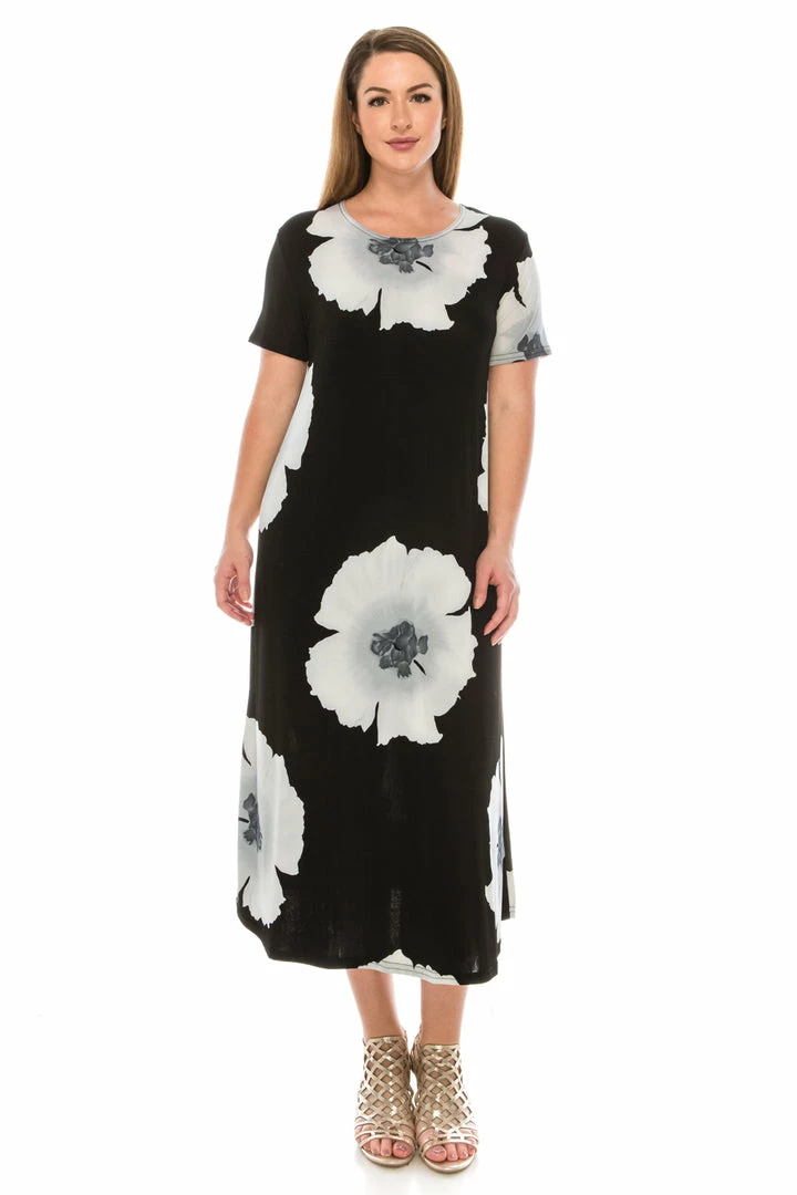 - Short sleeve and soft round-neckline long dress with a variety of prints available and 49 inches in length.