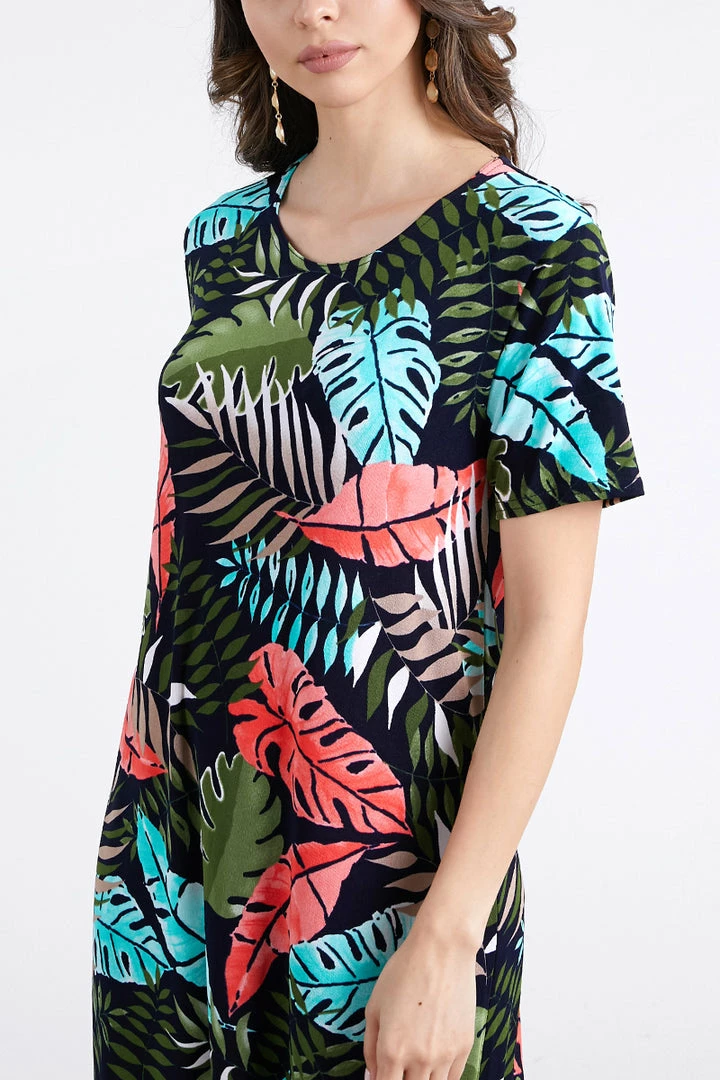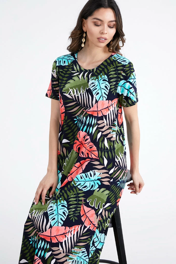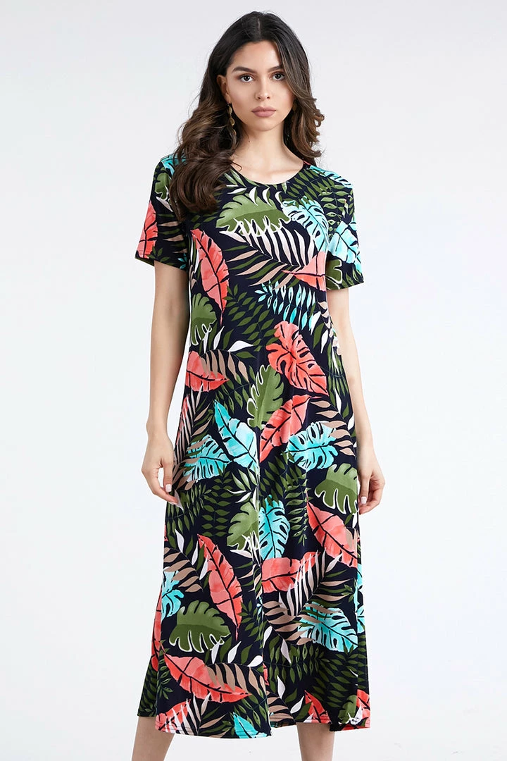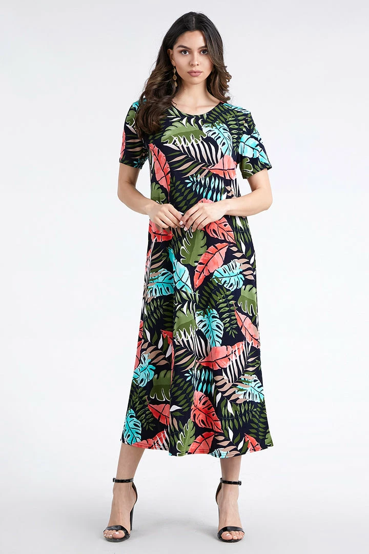 Short sleeve and soft round-neckline long dress with a variety of prints available and 49 inches in length.Hand or machine wash in cold water.Made in USA.90% Polyester, 10% Spandex.