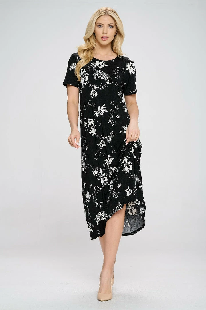 - Short sleeve and soft round-neckline long dress with a variety of prints available and 49 inches in length.