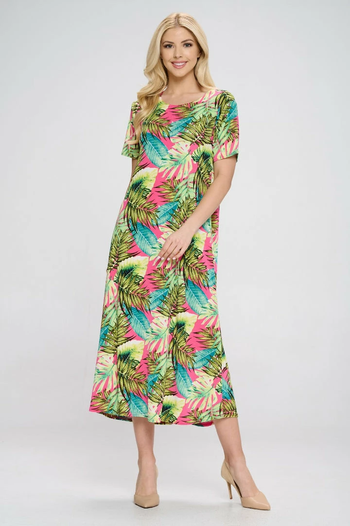 - Short sleeve and soft round-neckline long dress with a variety of prints available and 49 inches in length.