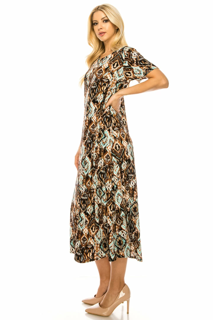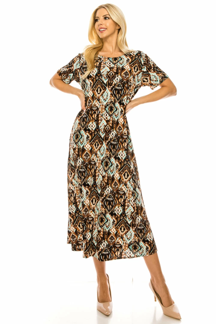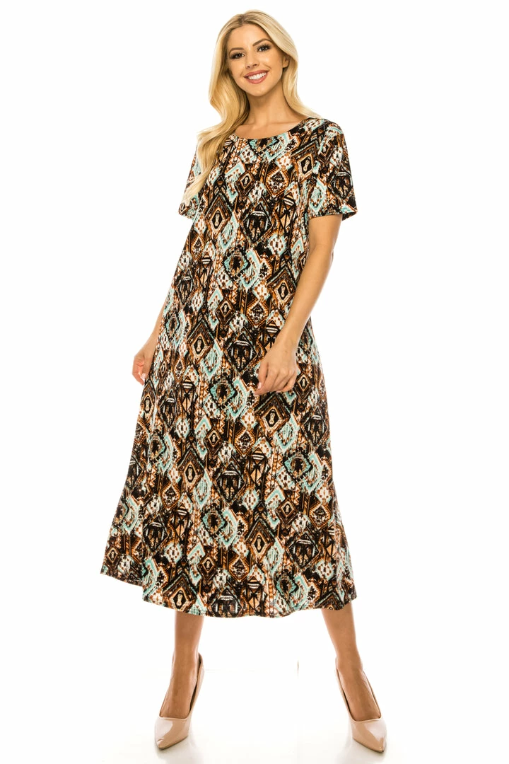 Jostar Women’s Stretchy Long Dress Short Sleeve Print, 702BN-SRP1-W318 Long Length
