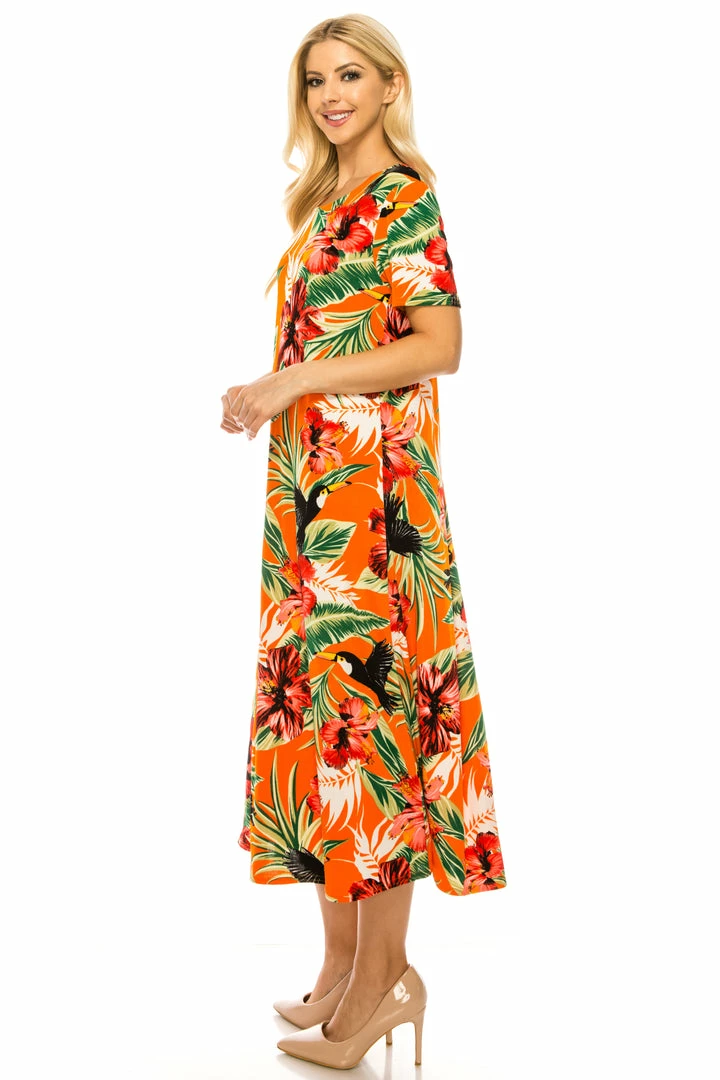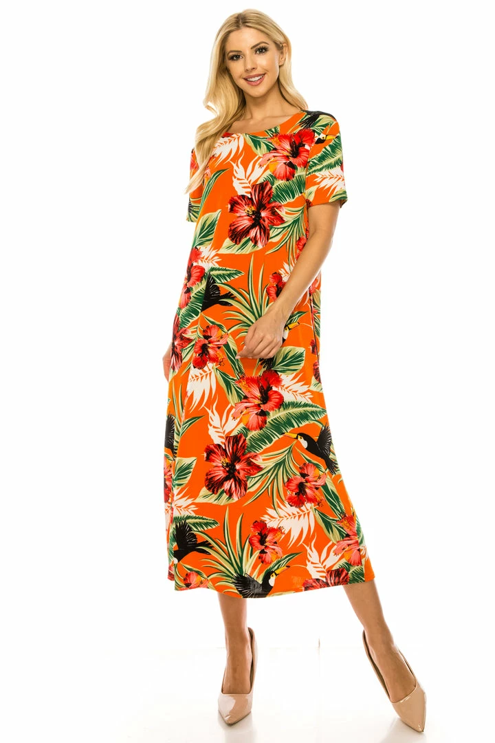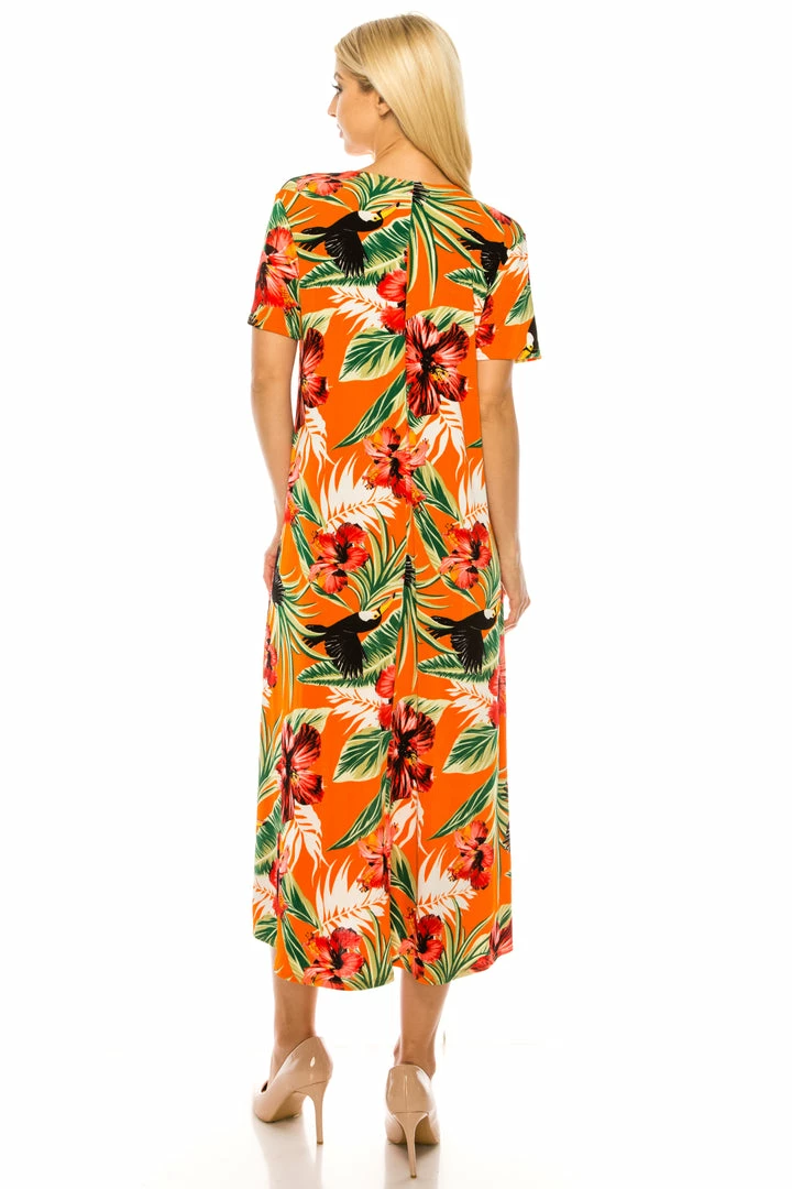 - Short sleeve and soft round-neckline long dress with a variety of prints available and 49 inches in length.