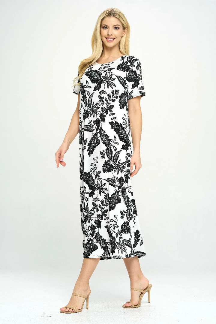 - Short sleeve and soft round-neckline long dress with a variety of prints available and 49 inches in length.