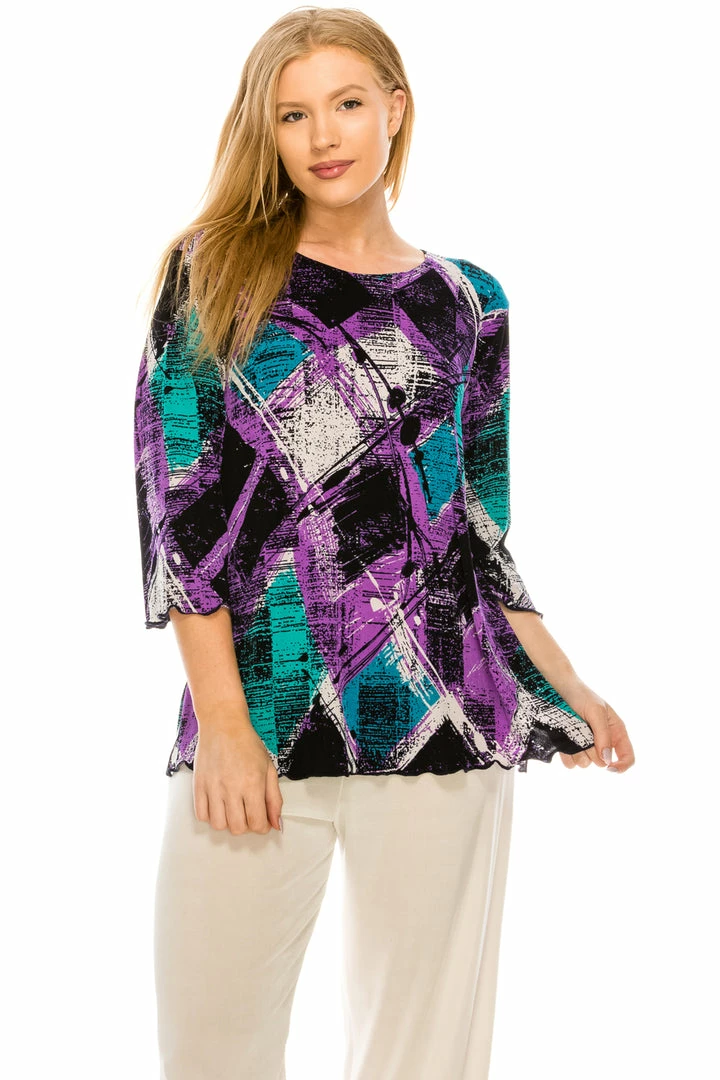 3/4 Sleeves and soft round-neckline with Merrow bottom in plus size.Hand or machine wash in cold water.Made in USA.90% Polyester, 10% Spandex.