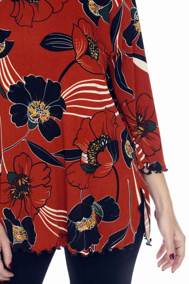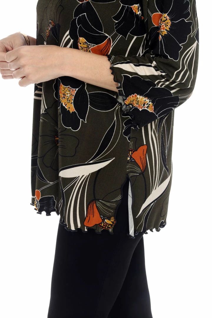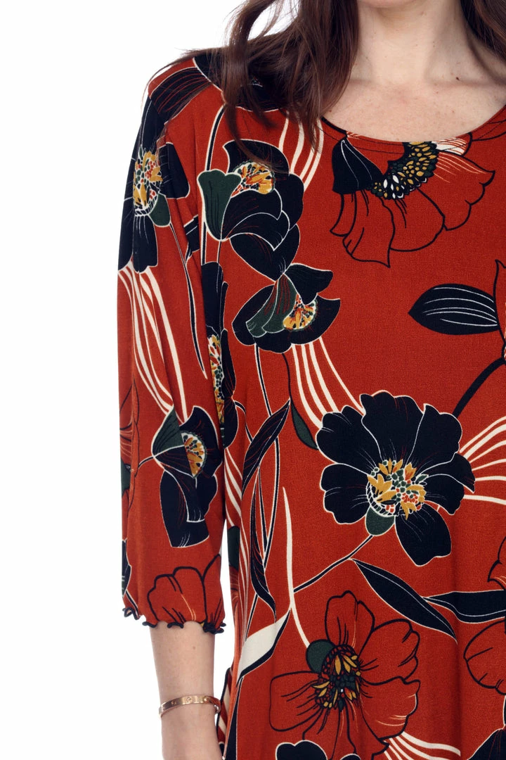 - 3/4 sleeves and soft round-neckline with Merrow bottom with a variety of prints available and an approximate length from shoulder to hem is 27 1/2 inches in size XL.