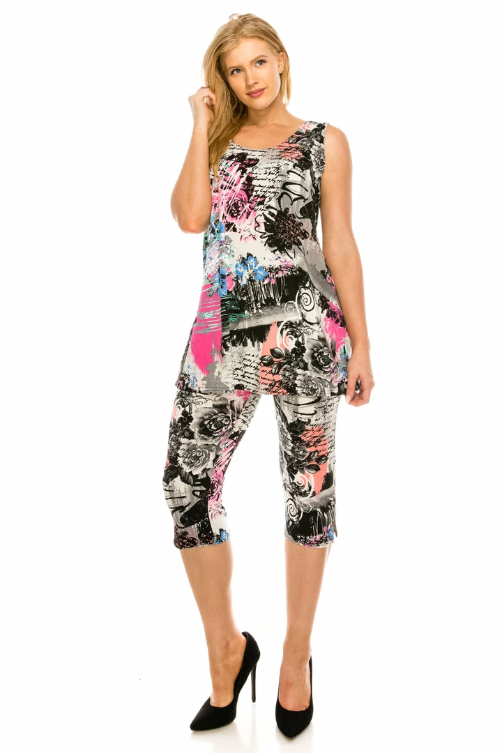 - Round neck tank top and capri pants set with a variety of prints available.